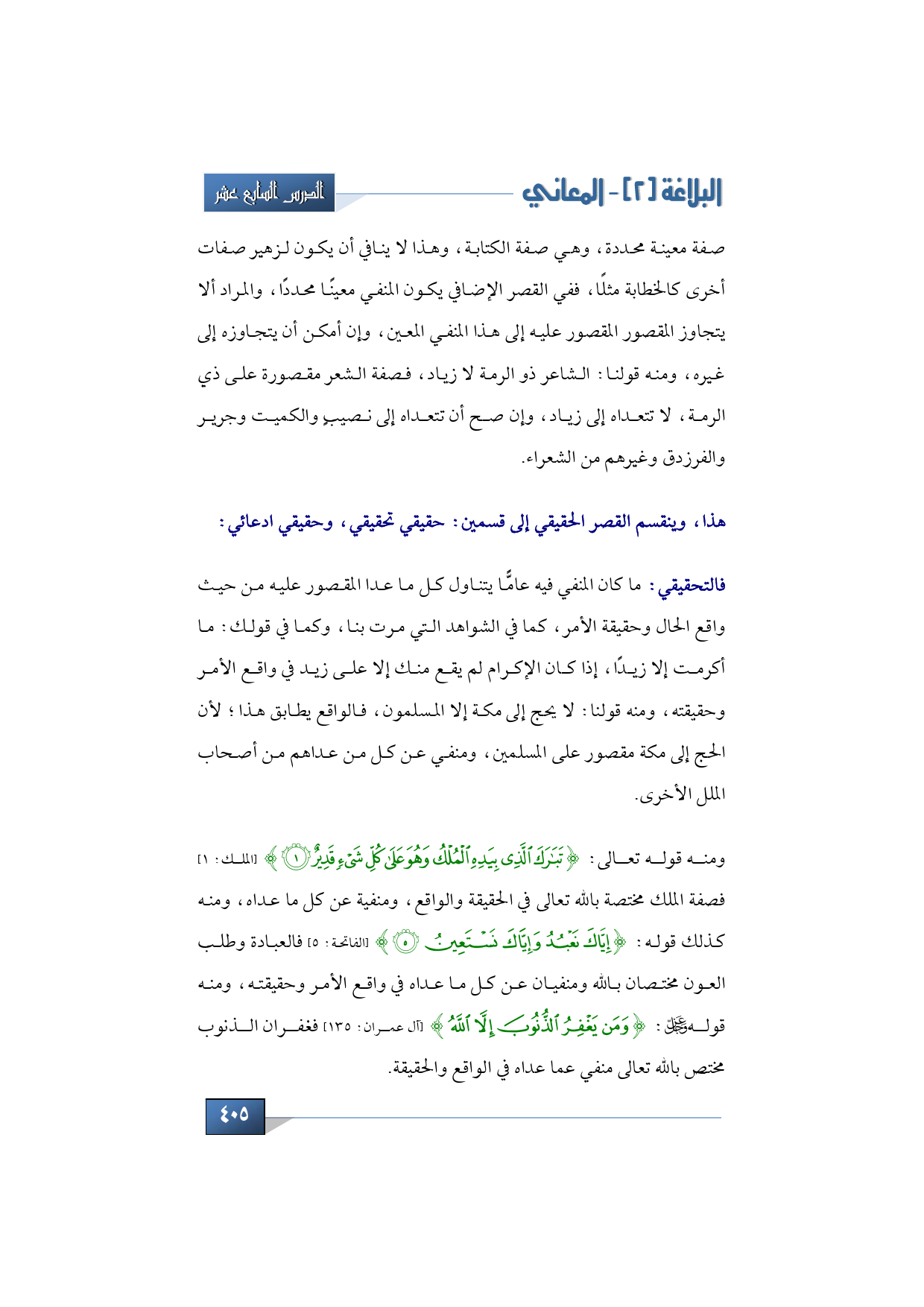 هذا، وينقسم القصر الحقيقي إلى قسمين: حقيقي تحقيقي، وحقيقي ادعائي، فالتحقيقي ما كان المنفي فيه عامًّا يتناول كل ما عدا المقصور عليه من حيث واقع الحال وحقيقة الأمر، كما في الشواهد التي مرت بنا، وكما في قولك: ما أكرمت إلا زيدًا، إذا كان الإكرام لم يقع منك إلا على زيد في واقع الأمر وحقيقته، ومنه قولنا: لا يحج إلى مكة إلا المسلمون، فالواقع يطابق هذا؛ لأن الحج إلى مكة مقصور على المسلمين، ومنفي عن كل من عداهم من أصحاب الملل الأخرى، ومنه قوله تعالى: {تَبَارَكَ الَّذِي بِيَدِهِ الْمُلْكُ وَهُوَ عَلَى كُلِّ شَيْءٍ قَدِيرٌ} (الملك: 1) فصفة الملك مختصة بالله تعالى في الحقيقة والواقع، ومنفية عن كل ما عداه، ومنه كذلك قوله: {إِيَّاكَ نَعْبُدُ وَإِيَّاكَ نَسْتَعِينُ} (الفاتحة: 5) فالعبادة وطلب العون مختصان بالله ومنفيان عن كل ما عداه في واقع الأمر وحقيقته، ومنه قوله عز وجل: {وَمَنْ يَغْفِرُ الذُّنُوبَ إِلَّا اللَّهُ} (آل عمران: 135)، فغفران الذنوب مختص بالله تعالى منفي عما عداه في الواقع والحقيقة.