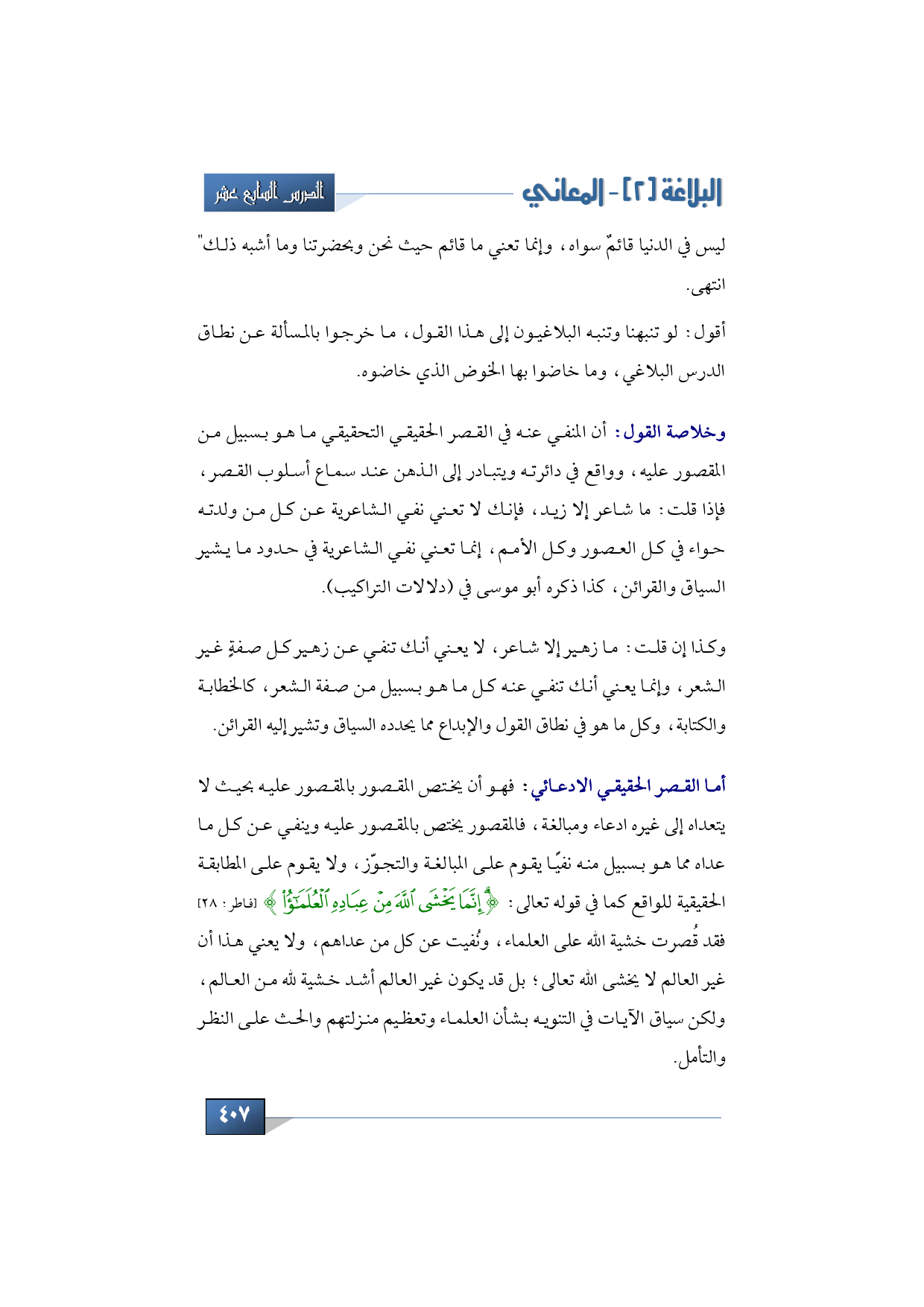 وكذا إن قلت: ما زهير إلا شاعر، لا يعني أنك تنفي عن زهير كل صفة غير الشعر، وإنما يعني أنك تنفي عنه كل ما هو بسبيل من صفة الشعر، كالخطابة والكتابة، وكل ما هو في نطاق القول والإبداع مما يحدده السياق وتشير إليه القرائن، أما القصر الحقيقي الادعائي فهو أن يختص المقصور بالمقصور عليه بحيث لا يتعداه إلى غيره ادعاء ومبالغة، فالمقصور يختص بالمقصور عليه وينفي عن كل ما عداه مما هو بسبيل منه نفيًا يقوم على المبالغة والتجوّز، ولا يقوم على المطابقة الحقيقية للواقع كما في قوله تعالى: {إِنَّمَا يَخْشَى اللَّهَ مِنْ عِبَادِهِ الْعُلَمَاءُ} (فاطر: 28)، فقد قُصرت خشية الله على العلماء، ونُفيت عن كل من عداهم، ولا يعني هذا أن غير العالم لا يخشى الله تعالى، بل قد يكون غير العالم أشد خشية لله من العالم، ولكن سياق الآيات في التنويه بشأن العلماء وتعظيم منزلتهم والحث على النظر والتأمل.