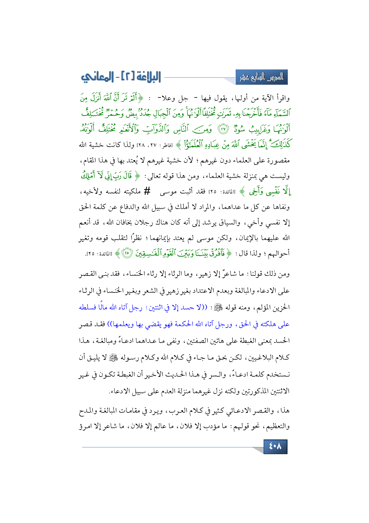 ومن ذلك قولنا: ما شاعرٌ إلا زهير، وما الرثاء إلا رثاء الخنساء، فقد بنى القصر على الادعاء والمبالغة وبعدم الاعتداد بغير زهير في الشعر وبغير الخنساء في الرثاء الحزين المؤلم، ومنه قوله -صلى الله عليه وسلم: ((لا حسد إلا في اثنتين: رجل آتاه الله مالًا فسلطه على هلكته في الحق، ورجل آتاه الله الحكمة فهو يقضي بها ويعلمها)) فقد قصر الحسد بمعنى الغبطة على هاتين الصفتين، ونفى ما عداهما ادعاءً ومبالغة، هذا كلام البلاغيين، لكن بحق ما جاء في كلام الله وكلام رسوله -صلى الله عليه وسلم- لا يليق أن نستخدم كلمة ادعاءً، والسر في هذا الحديث الأخير أن الغبطة تكون في غير الاثنتين المذكورتين ولكنه نزل غيرهما منزلة العدم على سبيل الادعاء. هذا والقصر الادعائي كثير في كلام العرب، ويرد في مقامات المبالغة والمدح والتعظيم، نحو قولهم: ما مؤدب إلا فلان، ما عالم إلا فلان، ما شاعر إلا امرؤ