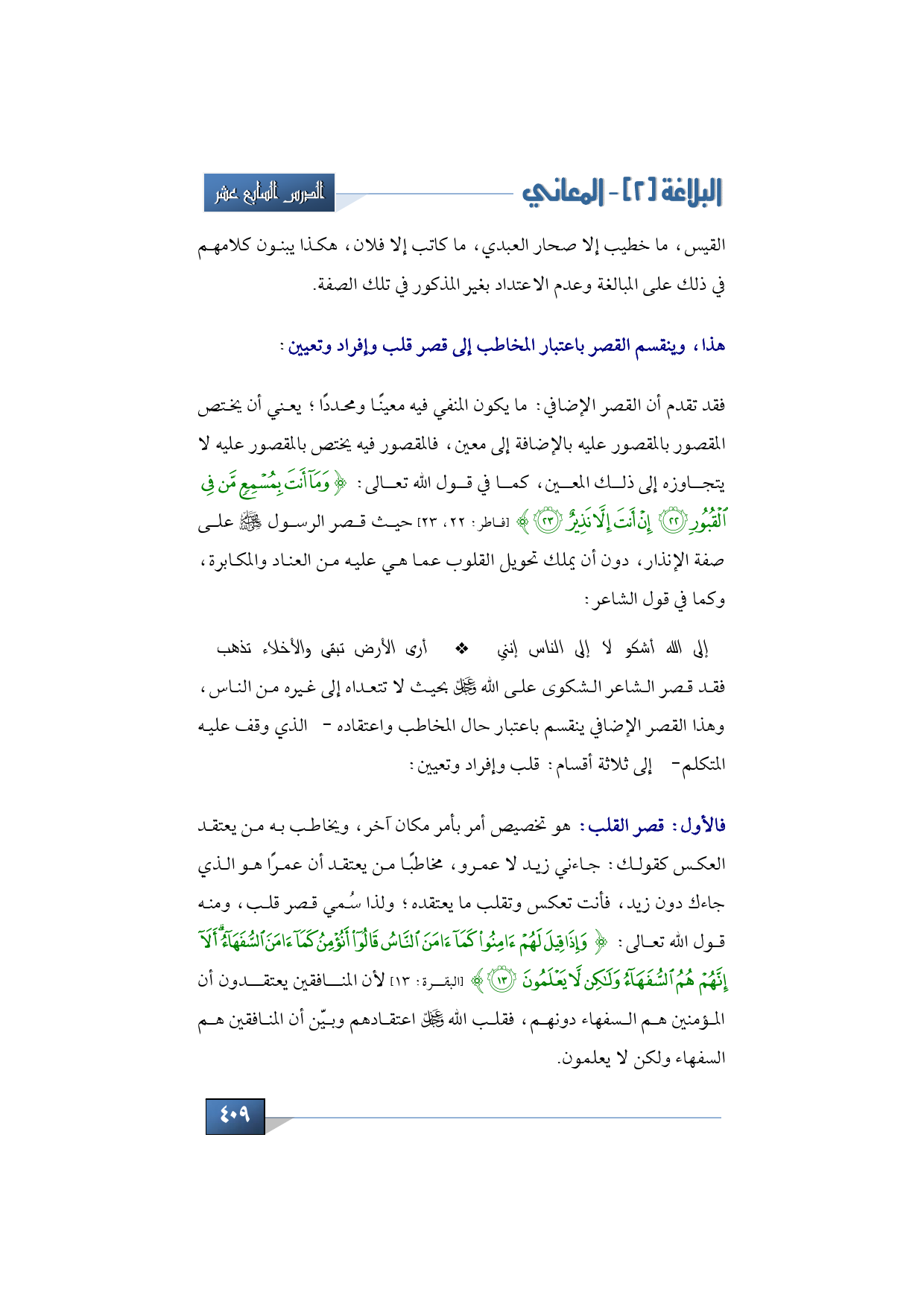 فقد قصر الشاعر الشكوى على الله -عز وجل- بحيث لا تتعداه إلى غيره من الناس، وهذا القصر الإضافي ينقسم باعتبار حال المخاطب واعتقاده -الذي وقف عليه المتكلم- إلى ثلاثة أقسام: قلب وإفراد وتعيين؛ فقصر القلب هو تخصيص أمر بأمر مكان آخر، ويخاطب به من يعتقد العكس كقولك: جاءني زيد لا عمرو، مخاطبًا من يعتقد أن عمرًا هو الذي جاءك دون زيد، فأنت تعكس وتقلب ما يعتقده؛ ولذا سُمي قصر قلب، ومنه قول الله تعالى: {وَإِذَا قِيلَ لَهُمْ آمِنُوا كَمَا آمَنَ النَّاسُ قَالُوا أَنُؤْمِنُ كَمَا آمَنَ السُّفَهَاءُ أَلَا إِنَّهُمْ هُمُ السُّفَهَاءُ وَلَكِنْ لَا يَعْلَمُونَ} (البقرة: 13) لأن المنافقين يعتقدون أن المؤمنين هم السفهاء دونهم، فقلب الله -عز وجل- اعتقادهم وبيّن أن المنافقين هم السفهاء ولكن لا يعلمون.
