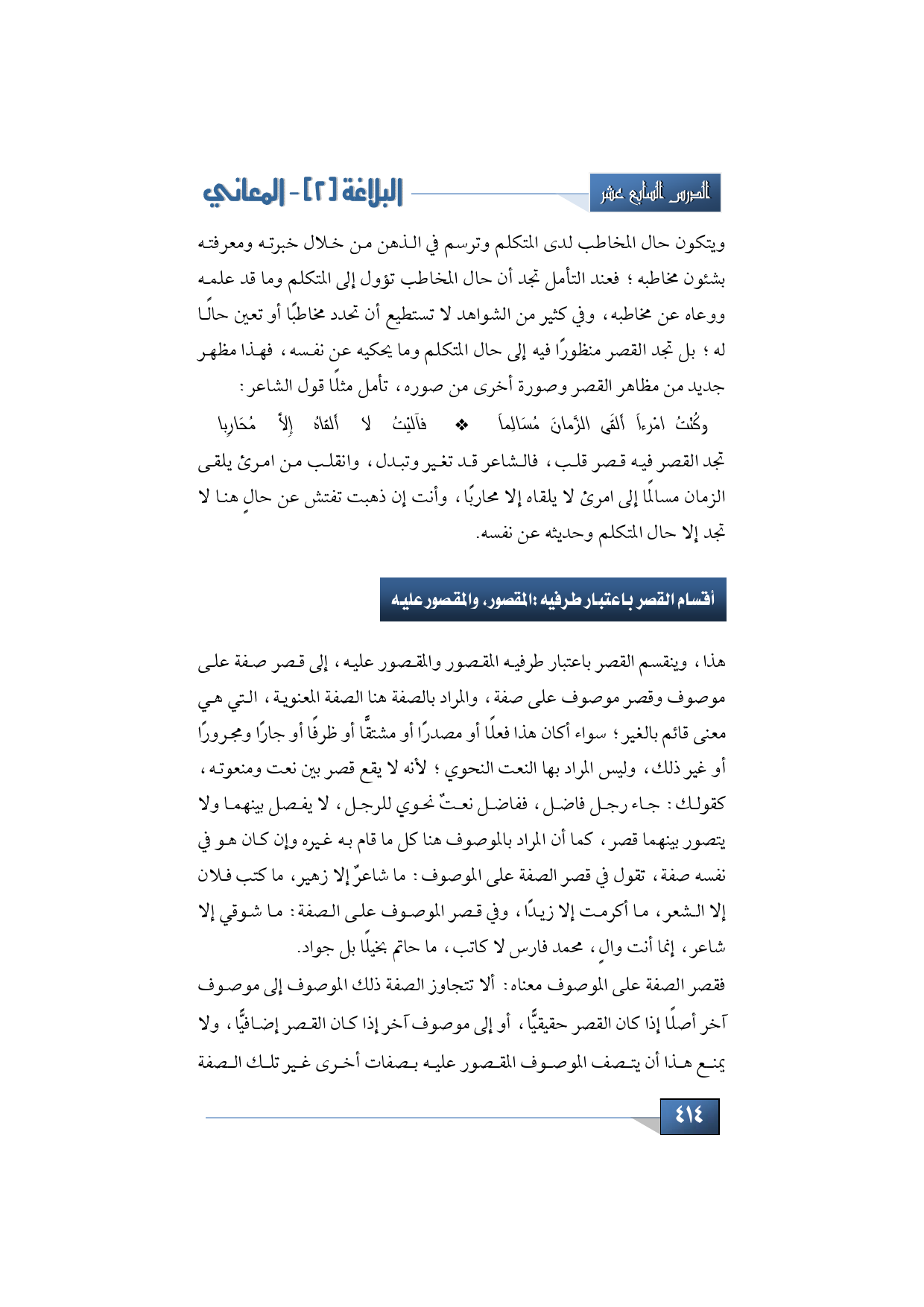 هذا وينقسم القصر باعتبار طرفيه المقصور والمقصور عليه، إلى قصر صفة على موصوف وقصر موصوف على صفة، والمراد بالصفة هنا الصفة المعنوية، التي هي معنى قائم بالغير؛ سواء أكان هذا فعلًا أو مصدرًا أو مشتقًّا أو ظرفًا أو جارًا ومجرورًا أو غير ذلك، وليس المراد بها النعت النحوي؛ لأنه لا يقع قصر بين نعت ومنعوته، كقولك: جاء رجل فاضل، ففاضل نعتٌ نحوي للرجل، لا يفصل بينهما ولا يتصور بينهما قصر، كما أن المراد بالموصوف هنا كل ما قام به غيره وإن كان هو في نفسه صفة، تقول في قصر الصفة على الموصوف: ما شاعرٌ إلا زهير، ما كتب فلان إلا الشعر، ما أكرمت إلا زيدًا، وفي قصر الموصوف على الصفة: ما شوقي إلا شاعر، إنما أنت والٍ، محمد فارس لا كاتب، ما حاتم بخيلًا بل جواد.