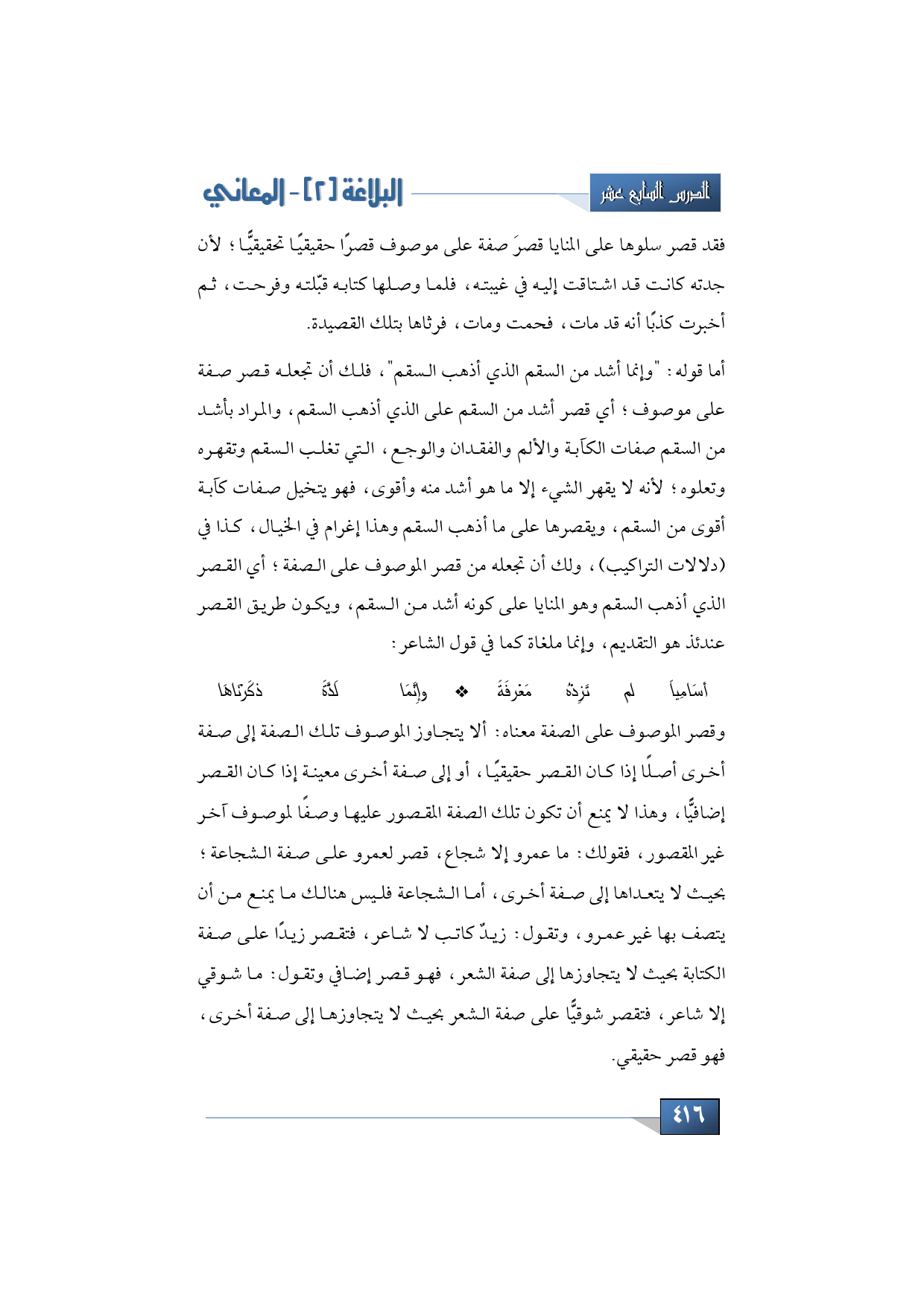 فقد قصر سلوها على المنايا قصرَ صفة على موصوف قصرًا حقيقيًا تحقيقيًّا؛ لأن جدته كانت قد اشتاقت إليه في غيبته، فلما وصلها كتابه قبّلته وفرحت، ثم أخبرت كذبًا أنه قد مات، فحمت ومات، فرثاها بتلك القصيدة. أما قوله: "وإنما أشد من السقم الذي أذهب السقم"، فلك أن تجعله قصر صفة على موصوف؛ أي قصر أشد من السقم على الذي أذهب السقم، والمراد بأشد من السقم صفات الكآبة والألم والفقدان والوجع، التي تغلب السقم وتقهره وتعلوه؛ لأنه لا يقهر الشيء إلا ما هو أشد منه وأقوى، فهو يتخيل صفات كآبة أقوى من السقم، ويقصرها على ما أذهب السقم وهذا إغرام في الخيال، كذا في (دلالات التراكيب)، ولك أن تجعله من قصر الموصوف على الصفة؛ أي القصر الذي أذهب السقم وهو المنايا على كونه أشد من السقم، ويكون طريق القصر عندئذ هو التقديم، وإنما ملغاة كما في قول الشاعر: