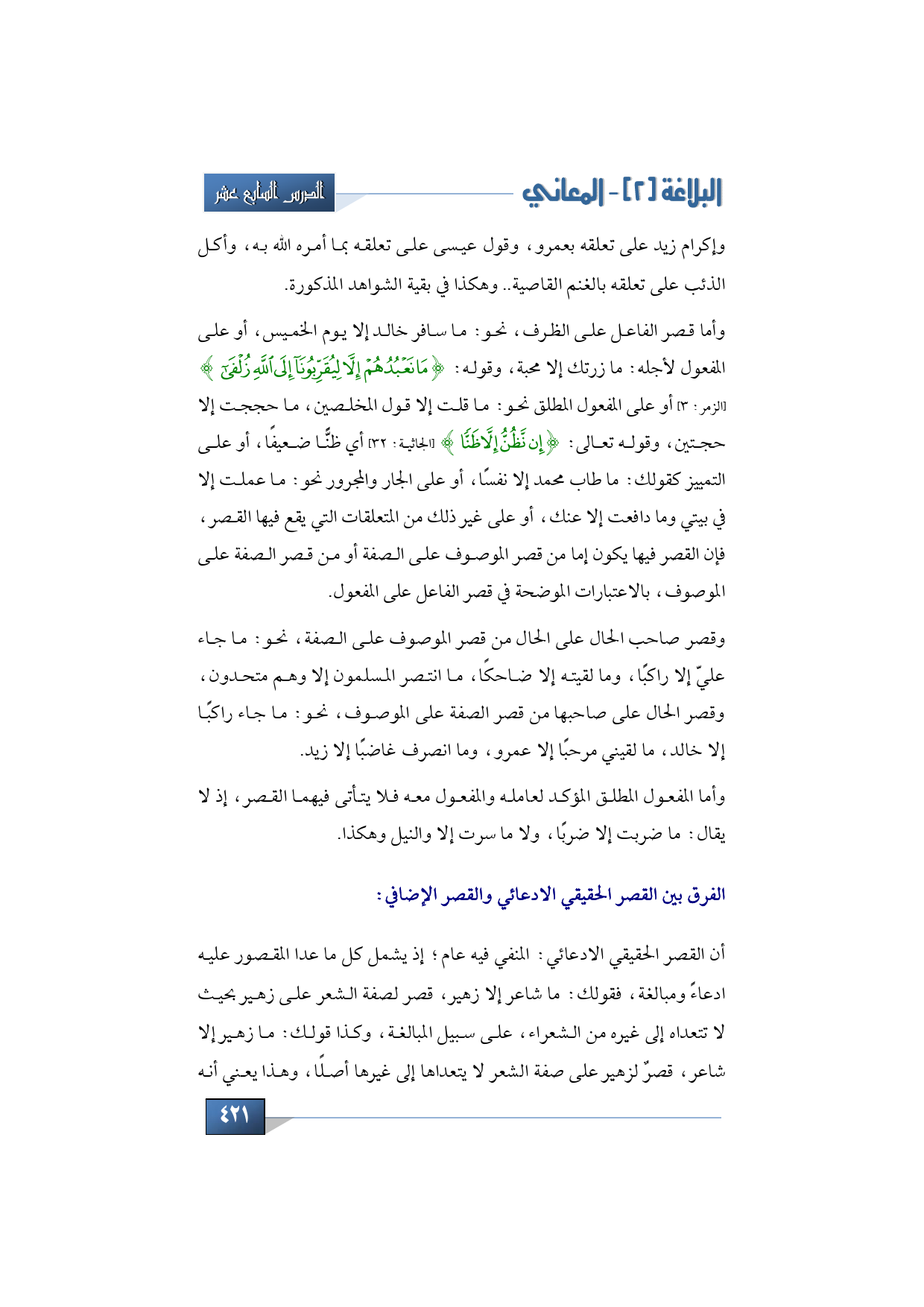 وقصر صاحب الحال على الحال من قصر الموصوف على الصفة، نحو: ما جاء عليّ إلا راكبًا، وما لقيته إلا ضاحكًا، ما انتصر المسلمون إلا وهم متحدون، وقصر الحال على صاحبها من قصر الصفة على الموصوف، نحو: ما جاء راكبًا إلا خالد، ما لقيني مرحبًا إلا عمرو، وما انصرف غاضبًا إلا زيد، وأما المفعول المطلق المؤكد لعامله والمفعول معه فلا يتأتى فيهما القصر، إذ لا يقال: ما ضربت إلا ضربًا، ولا ما سرت إلا والنيل وهكذا. السؤال إذن: ما الفرق بين القصر الحقيقي الادعائي والقصر الإضافي؟ هو على نحو ما مر بنا؛ أن القصر الحقيقي الادعائي: المنفي فيه عام؛ إذ يشمل كل ما عدا المقصور عليه ادعاءً ومبالغة، فقولك: ما شاعر إلا زهير، قصر لصفة الشعر على زهير بحيث لا تتعداه إلى غيره من الشعراء، على سبيل المبالغة، وكذا قولك: ما زهير إلا شاعر، قصرٌ لزهير على صفة الشعر لا يتعداها إلى غيرها أصلًًا، وهذا يعني أنه