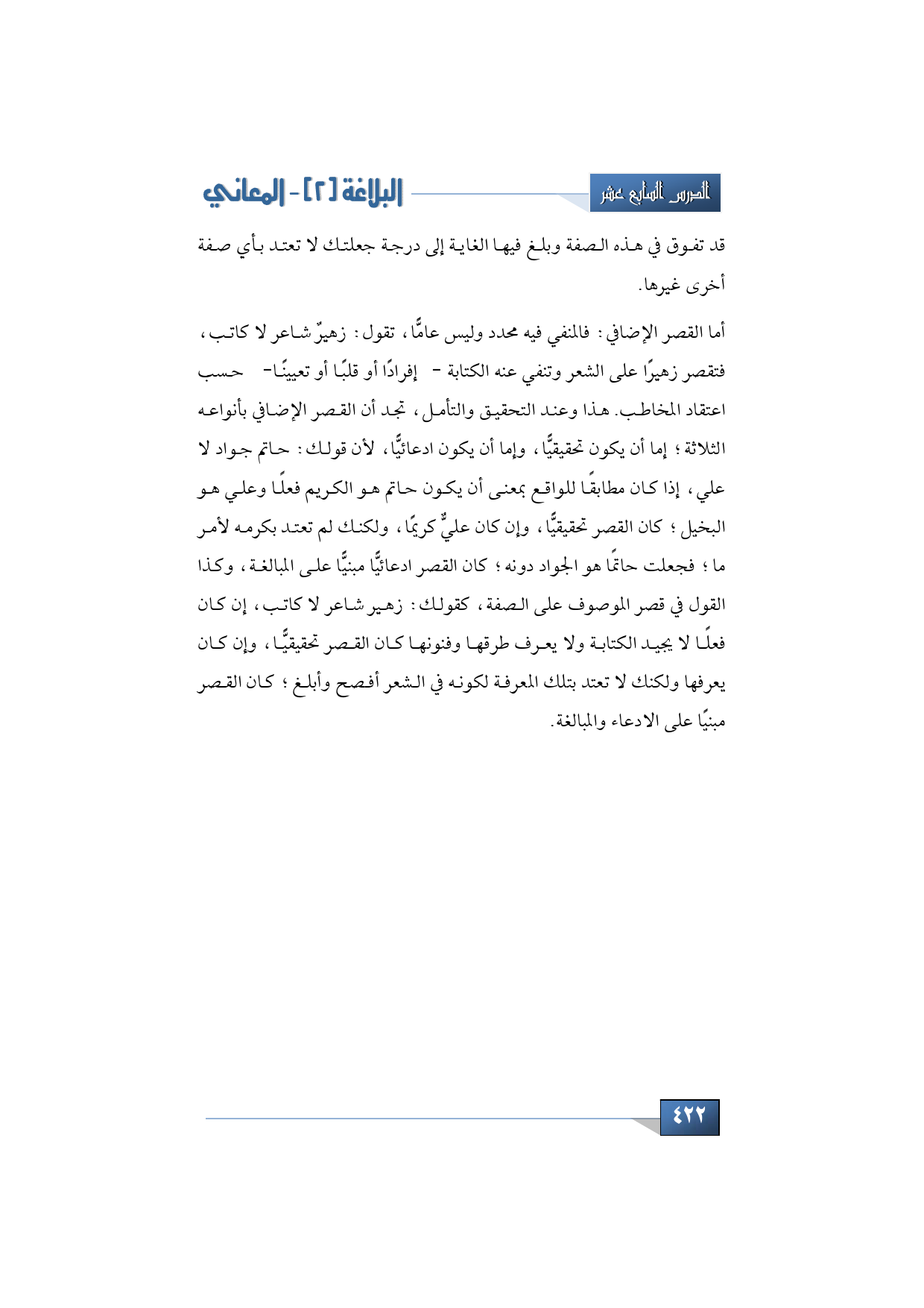 أما القصر الإضافي: فالمنفي فيه محدد وليس عامًّا، تقول: زهيرٌ شاعر لا كاتب، فتقصر زهيرا على الشعر وتنفي عنه الكتابة -إفرادًا أو قلبًا أو تعيينًا- حسب اعتقاد المخاطب. هذا وعند التحقيق والتأمل، تجد أن القصر الإضافي بأنواعه الثلاثة؛ إما أن يكون تحقيقيًّا، وإما أن يكون ادعائيًّا، لأن قولك: حاتم جواد لا علي، إذا كان مطابقًا للواقع بمعنى أن يكون حاتم هو الكريم فعلًا وعلي هو البخيل؛ كان القصر تحقيقيًّا، وإن كان عليٌّ كريمًا، ولكنك لم تعتد بكرمه لأمر ما؛ فجعلت حاتما هو الجواد دونه؛ كان القصر ادعائيًّا مبنيًا على المبالغة، وكذا القول في قصر الموصوف على الصفة، كقولك: زهير شاعر لا كاتب، إن كان فعلا لا يجيد الكتابة ولا يعرف طرقها وفنونها كان القصر تحقيقيًّا، وإن كان يعرفها ولكنك لا تعتد بتلك المعرفة لكونه في الشعر أفصح وأبلغ؛ كان القصر مبنيًا على الادعاء والمبالغة.