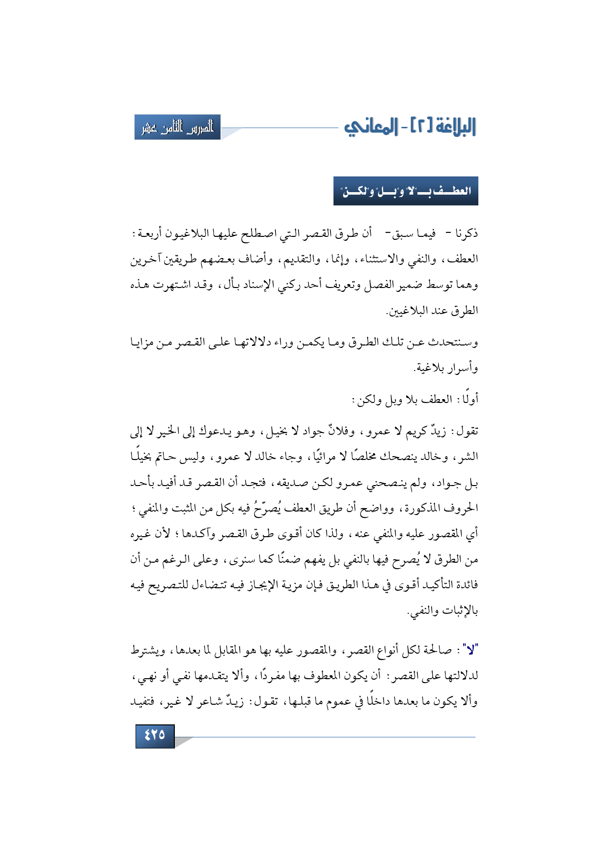 أولًا: العطف بلا وبل ولكن. تقول: زيدٌ كريم لا عمرو، وفلانٌ جواد لا بخيل، وهو يدعوك إلى الخير لا إلى الشر، وخالد ينصحك مخلصًا لا مرائيًا، وجاء خالد لا عمرو، وليس حاتم بخيلًا بل جواد، ولم ينصحني عمرو لكن صديقه، فتجد أن القصر قد أفيد بأحد الحروف المذكورة، وواضح أن طريق العطف يُصرّح فيه بكل من المثبت والمنفي؛ أي المقصور عليه والمنفي عنه، ولذا كان أقوى طرق القصر وآكدها؛ لأن غيره من الطرق لا يُصرح فيها بالنفي بل يفهم ضمنًا كما سنرى، وعلى الرغم من أن فائدة التأكيد أقوى في هذا الطريق فإن مزية الإيجاز فيه تتضاءل للتصريح فيه بالإثبات والنفي كما قلت.