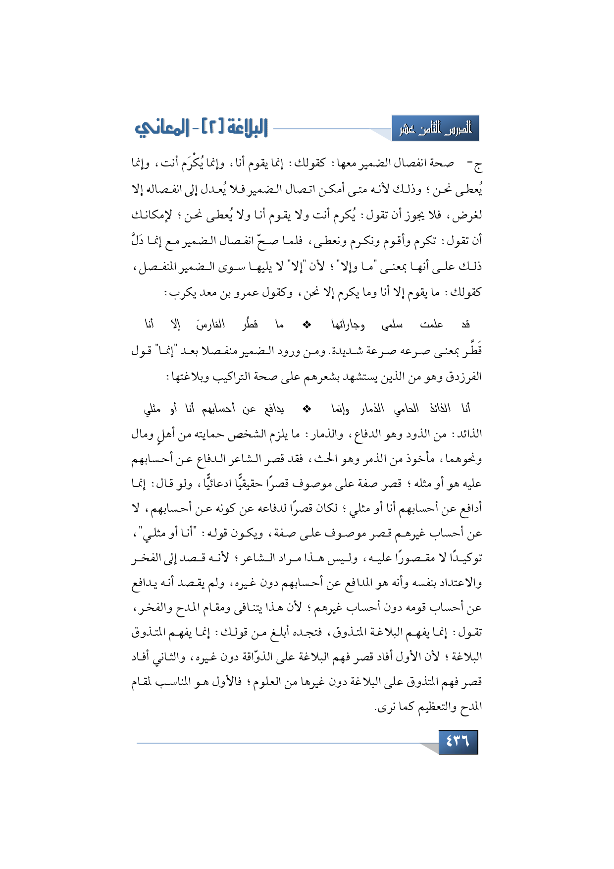 الذائد: من الذود وهو الدفاع، والذمار: ما يلزم الشخص حمايته من أهلٍ ومال ونحوهما، مأخوذ من الذمر وهو الحث، فقد قصر الشاعر الدفاع عن أحسابهم عليه هو أو مثله؛ قصر صفة على موصوف قصرًا حقيقيًّا ادعائيًّا، ولو قال: إنما أدافع عن أحسابهم أنا أو مثلي لكان قصرًا لدفاعه عن كونه عن أحسابهم، لا عن أحساب غيرهم قصر موصوف على صفة، ويكون قوله: "أنا أو مثلي"، توكيدًا لا مقصورًا عليه، وليس هذا مراد الشاعر؛ لأنه قصد إلى الفخر والاعتداد بنفسه وأنه هو المدافع عن أحسابهم دون غيره، ولم يقصد أنه يدافع عن أحساب قومه دون أحساب غيرهم؛ لأن هذا يتنافى ومقام المدح والفخر، تقول: إنما يفهم البلاغة المتذوق، فتجده أبلغ من قولك: إنما يفهم المتذوق البلاغة؛ لأن الأول أفاد قصر فهم البلاغة على الذوّاقة دون غيره، والثاني أفاد قصر فهم المتذوق على البلاغة دون غيرها من العلوم؛ فالأول هو المناسب لمقام المدح والتعظيم كما ترى.