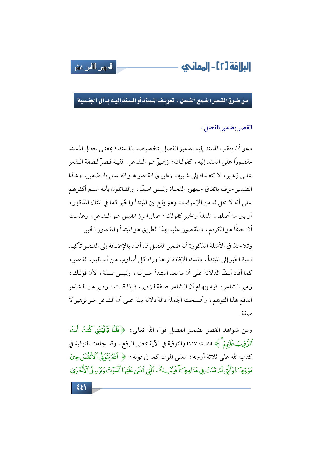 وتلاحظ في الأمثلة المذكورة أن ضمير الفصل قد أفاد بالإضافة إلى القصر تأكيد نسبة الخبر إلى المبتدأ، وتلك الإفادة تراها وراء كل أسلوب من أساليب القصر، كما أفاد أيضًا الدلالة على أن ما بعد المبتدأ خبر له، وليس صفة؛ لأن قولك: زهير الشاعر، فيه إيهام أن الشاعر صفة لزهير، فإذا قلت: زهير هو الشاعر اندفع هذا التوهم، وأصبحت الجملة دالة دلالة بينة على أن الشاعر خبر لزهير لا صفة. ومن شواهد القصر بضمير الفصل قول الله تعالى: {فَلَمَّا تَوَفَّيْتَنِي كُنْتَ أَنْتَ الرَّقِيبَ عَلَيْهِمْ} (المائدة: 117) والتوفية في الآية بمعنى الرفع، وقد جاءت التوفية في كتاب الله على ثلاثة أوجه؛ بمعنى الموت كما في قوله: {اللَّهُ يَتَوَفَّى الْأَنْفُسَ حِينَ مَوْتِهَا وَالَّتِي لَمْ تَمُتْ فِي مَنَامِهَا فَيُمْسِكُ الَّتِي قَضَى عَلَيْهَا الْمَوْتَ وَيُرْسِلُ الْأُخْرَى