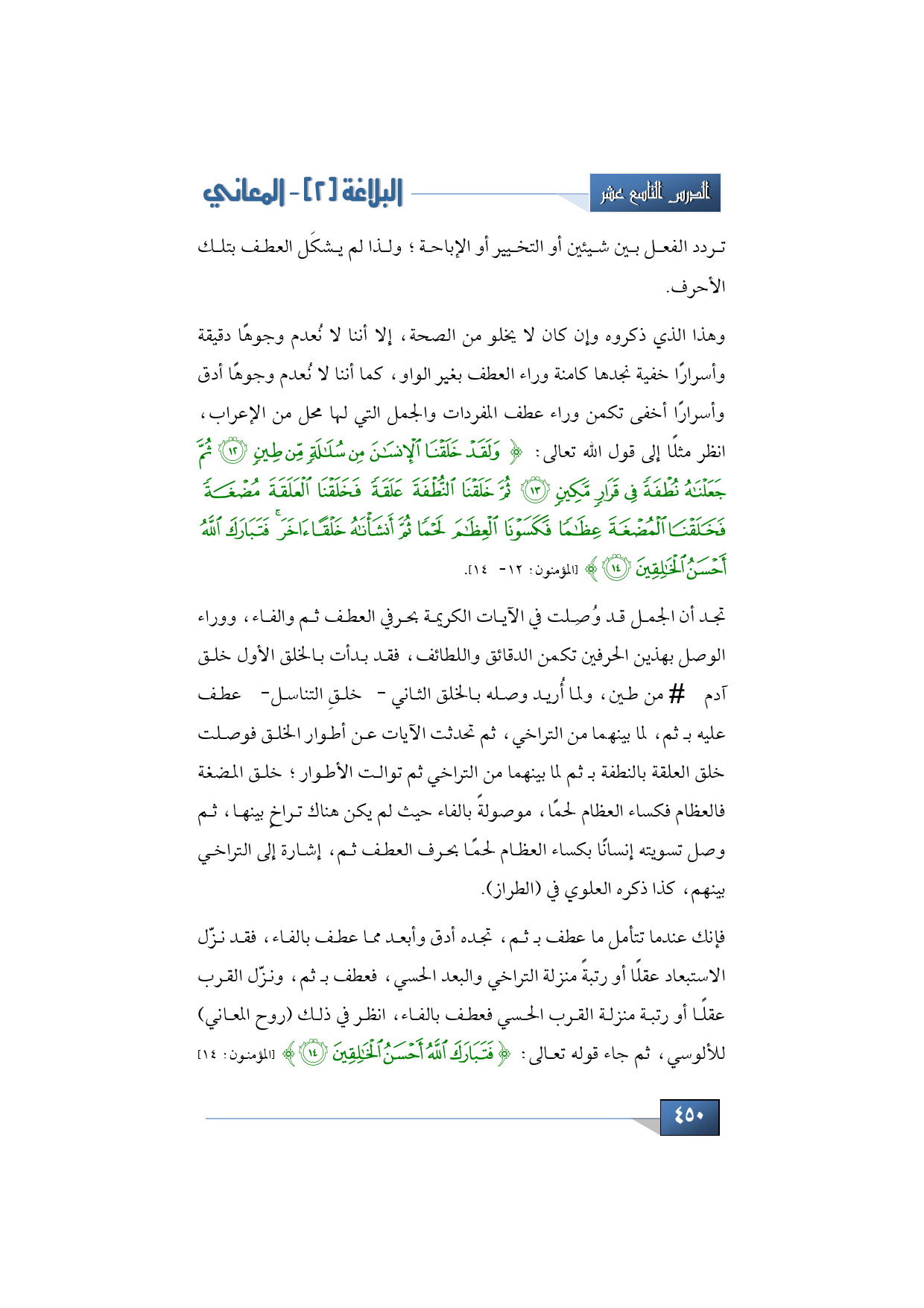 فإنك عندما تتأمل ما عطف بـ ثم، تجده أدق وأبعد مما عطف بالفاء، فقد نزّل الاستبعاد عقلًا أو رتبةً منزلة التراخي والبعد الحسي، فعطف بـ ثم، ونزّل القرب عقلًا أو رتبة منزلة القرب الحسي فعطف بالفاء، انظر في ذلك (روح المعاني) للألوسي ثم جاء قوله تعالى: {فَتَبَارَكَ اللَّهُ أَحْسَنُ الْخَالِقِينَ} (المؤمنون: 14)