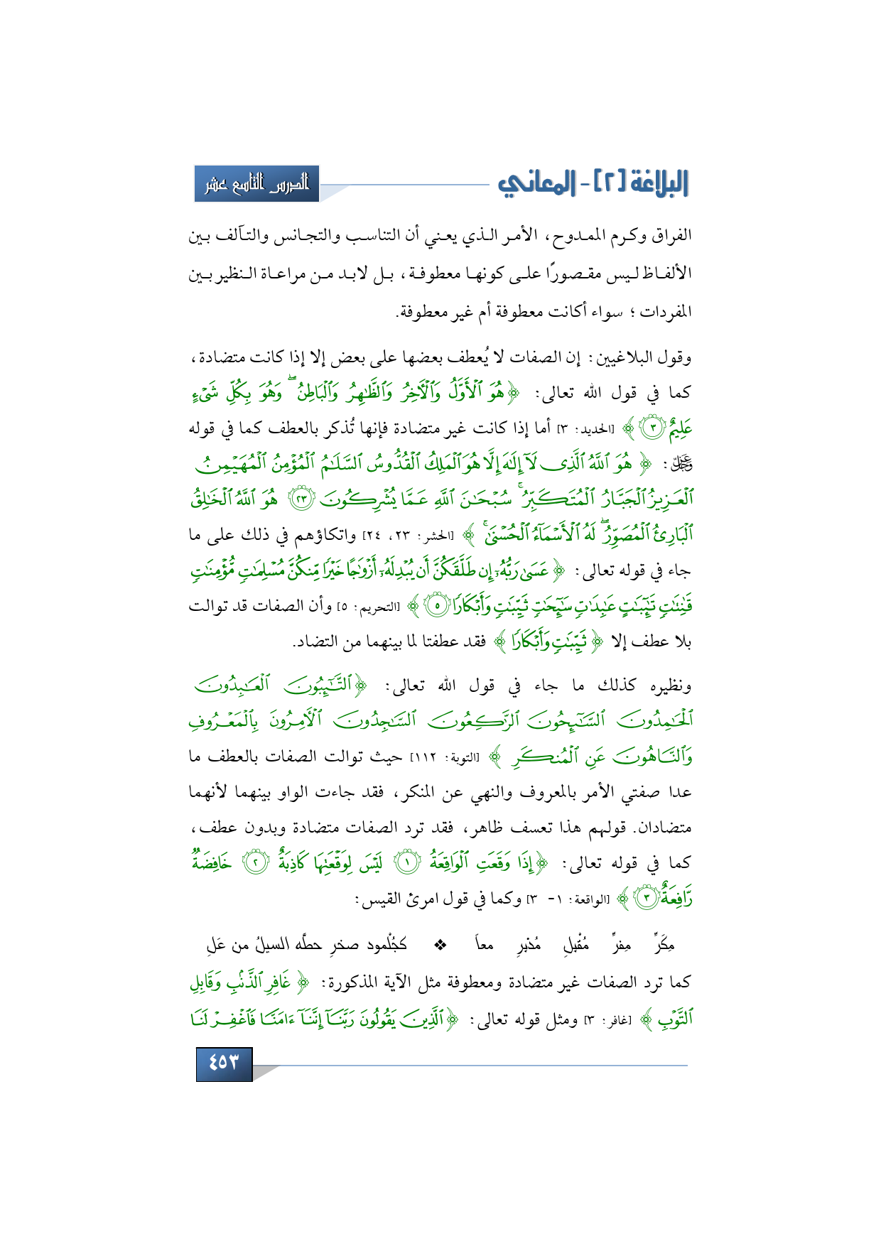 وقول البلاغيين: إن الصفات لا يُعطف بعضها على بعض إلا إذا كانت متضادة، كما في قول الله تعالى: {هُوَ الْأَوَّلُ وَالْآخِرُ وَالظَّاهِرُ وَالْبَاطِنُ وَهُوَ بِكُلِّ شَيْءٍ عَلِيمٌ} (الحديد: 3) أما إذا كانت غير متضادة فإنها تُذكر بالعطف كما في قوله عز وجل: {هُوَ اللَّهُ الَّذِي لَا إِلَهَ إِلَّا هُوَ الْمَلِكُ الْقُدُّوسُ السَّلَامُ الْمُؤْمِنُ الْمُهَيْمِنُ الْعَزِيزُ الْجَبَّارُ الْمُتَكَبِّرُ سُبْحَانَ اللَّهِ عَمَّا يُشْرِكُونَ * هُوَ اللَّهُ الْخَالِقُ الْبَارِئُ الْمُصَوِّرُ لَهُ الْأَسْمَاءُ الْحُسْنَى} (الحشر: 23، 24) واتكاؤهم في ذلك على ما جاء في قوله تعالى: {عَسَى رَبُّهُ إِنْ طَلَّقَكُنَّ أَنْ يُبْدِلَهُ أَزْوَاجًا خَيْرًا مِنْكُنَّ مُسْلِمَاتٍ مُؤْمِنَاتٍ قَانِتَاتٍ تَائِبَاتٍ عَابِدَاتٍ سَائِحَاتٍ ثَيِّبَاتٍ وَأَبْكَارًا} (التحريم: 5) وأن الصفات قد توالت بلا عطف إلا {ثَيِّبَاتٍ وَأَبْكَارًا} فقد عطفتا لما بينهما من التضاد، ونظيره كذلك ما جاء في قول الله تعالى: {التَّائِبُونَ الْعَابِدُونَ الْحَامِدُونَ السَّائِحُونَ الرَّاكِعُونَ السَّاجِدُونَ الْآمِرُونَ بِالْمَعْرُوفِ وَالنَّاهُونَ عَنِ الْمُنْكَرِ} (التوبة: 112) حيث توالت الصفات بالعطف ما عدا صفتي الأمر بالمعروف والنهي عن المنكر، فقد جاءت الواو بينهما لأنهما متضادان. قولهم هذا تعسف ظاهر، فقد ترد الصفات متضادة وبدون عطف، كما في قوله تعالى: {إِذَا وَقَعَتِ الْوَاقِعَةُ * لَيْسَ لِوَقْعَتِهَا كَاذِبَةٌ * خَافِضَةٌ رَافِعَةٌ} (الواقعة: 1 - 3) وكما في قول امرئ القيس: