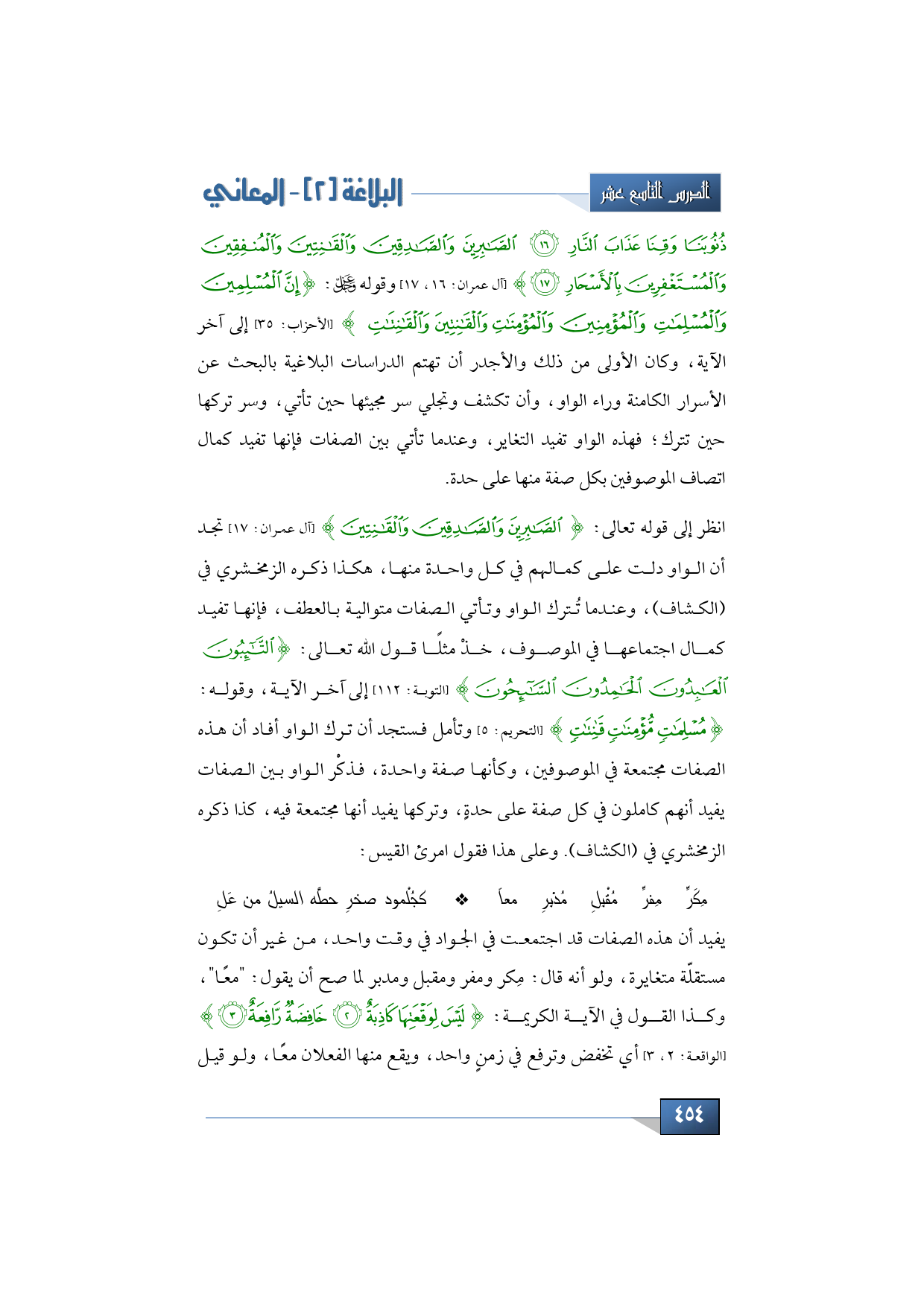 ذُنُوبَنَا وَقِنَا عَذَابَ النَّارِ * الصَّابِرِينَ وَالصَّادِقِينَ وَالْقَانِتِينَ وَالْمُنْفِقِينَ وَالْمُسْتَغْفِرِينَ بِالْأَسْحَارِ} (آل عمران: 16، 17) وقوله عز وجل: {إِنَّ الْمُسْلِمِينَ وَالْمُسْلِمَاتِ وَالْمُؤْمِنِينَ وَالْمُؤْمِنَاتِ وَالْقَانِتِينَ وَالْقَانِتَاتِ} (الأحزاب: 35) إلى آخر الآية، وكان الأولى من ذلك والأجدر أن تهتم الدراسات البلاغية بالبحث عن الأسرار الكامنة وراء الواو، وأن تكشف وتجلي سر مجيئها حين تأتي، وسر تركها حين تترك؛ فهذه الواو تفيد التغاير، وعندما تأتي بين الصفات فإنها تفيد كمال اتصاف الموصوفين بكل صفة منها على حدة.