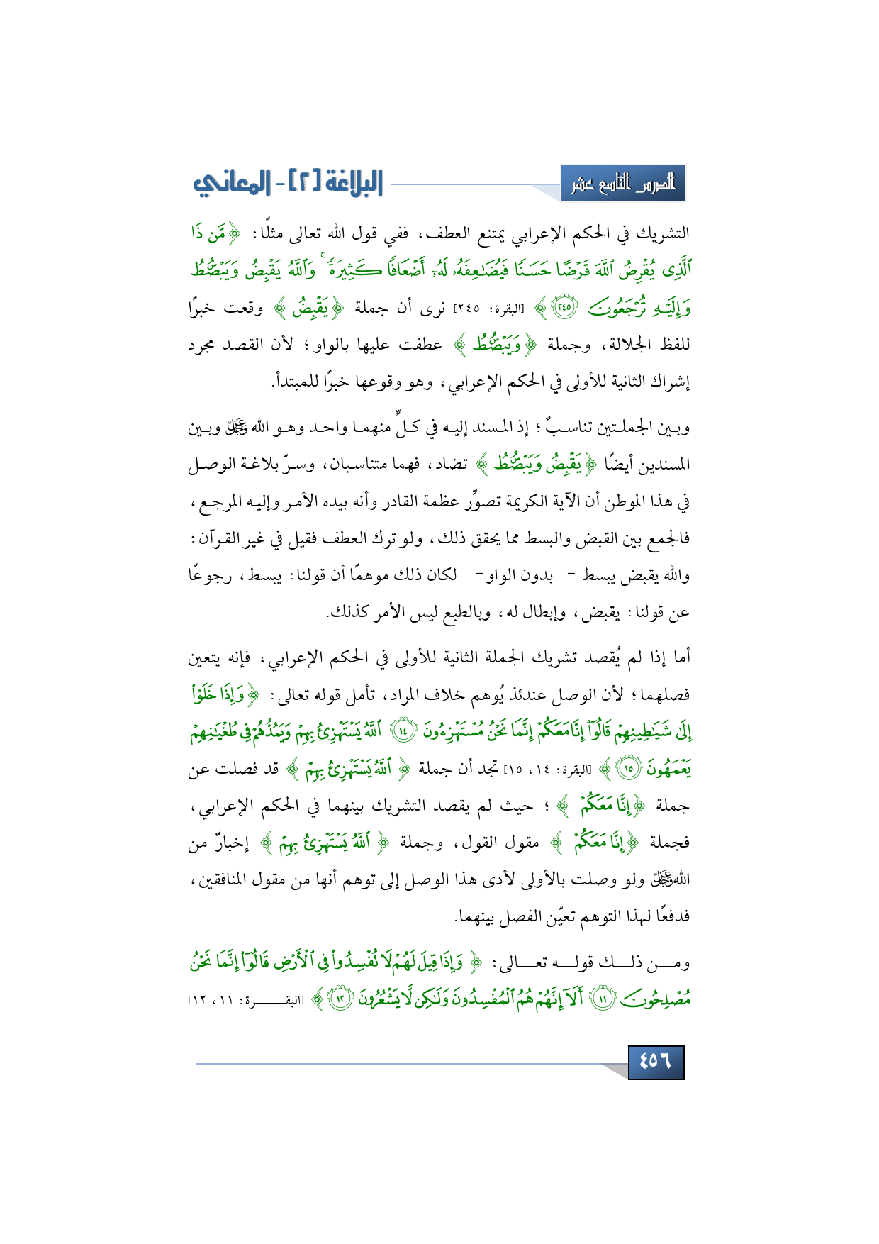 وبين الجملتين تناسبٌ؛ إذ المسند إليه في كلٍّ منهما واحد وهو الله -عز وجل- وبين المسندين أيضًا {يَقْبِضُ وَيَبْسُطُ} تضاد، فهما متناسبان، وسرّ بلاغة الوصل في هذا الموطن أن الآية الكريمة تصوِّر عظمة القادر وأنه بيده الأمر وإليه المرجع، فالجمع بين القبض والبسط مما يحقق ذلك، ولو ترك العطف فقيل في غير القرآن: والله يقبض يبسط -بدون الواو- لكان ذلك موهمًا أن قولنا: يبسط، رجوعًا عن قولنا: يقبض، وإبطال له، وبالطبع ليس الأمر كذلك. أما إذا لم يُقصد تشريك الجملة الثانية للأولى في الحكم الإعرابي، فإنه يتعين فصلهما؛ لأن الوصل عندئذ يُوهم خلاف المراد، تأمل قوله تعالى: {وَإِذَا خَلَوْا إِلَى شَيَاطِينِهِمْ قَالُوا إِنَّا مَعَكُمْ إِنَّمَا نَحْنُ مُسْتَهْزِئُونَ * اللَّهُ يَسْتَهْزِئُ بِهِمْ وَيَمُدُّهُمْ فِي طُغْيَانِهِمْ يَعْمَهُونَ} (البقرة: 14، 15) تجد أن جملة {اللَّهُ يَسْتَهْزِئُ بِهِمْ} قد فصلت عن جملة {إِنَّا مَعَكُمْ}؛ حيث لم يقصد التشريك بينهما في الحكم الإعرابي، فجملة {إِنَّا مَعَكُمْ} مقول القول، وجملة {اللَّهُ يَسْتَهْزِئُ بِهِمْ} إخبارٌ من الله -عز وجل- ولو وصلت بالأولى لأدى هذا الوصل إلى توهم أنها من مقول المنافقين، فدفعًا لهذا التوهم تعيّن الفصل بينهما.