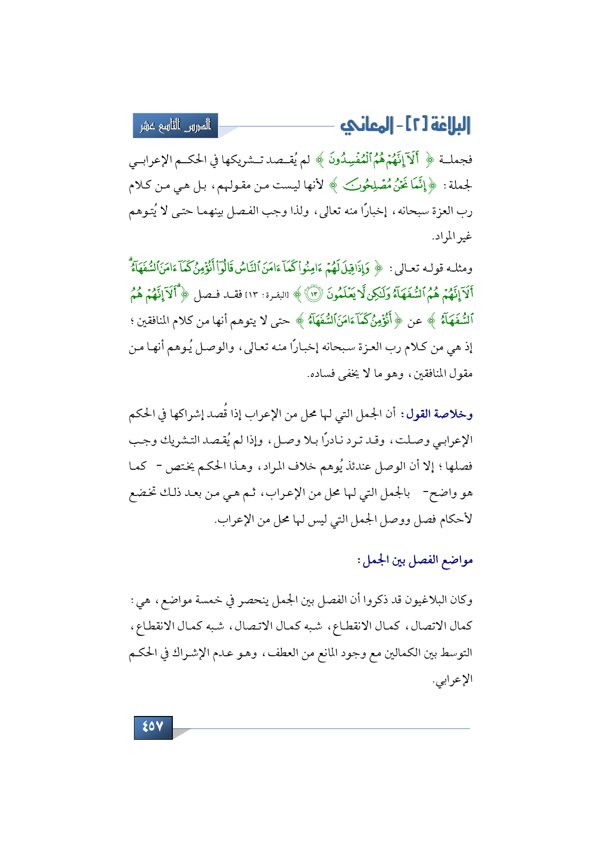 فجملة {أَلَا إِنَّهُمْ هُمُ الْمُفْسِدُونَ} لم يُقصد تشريكها في الحكم الإعرابي لجملة: {إِنَّمَا نَحْنُ مُصْلِحُونَ} لأنها ليست من مقولهم، بل هي من كلام رب العزة سبحانه، إخبارًا منه تعالى، ولذا وجب الفصل بينهما حتى لا يُتوهم غير المراد. ومثله قوله تعالى: {وَإِذَا قِيلَ لَهُمْ آمِنُوا كَمَا آمَنَ النَّاسُ قَالُوا أَنُؤْمِنُ كَمَا آمَنَ السُّفَهَاءُ أَلَا إِنَّهُمْ هُمُ السُّفَهَاءُ وَلَكِنْ لَا يَعْلَمُونَ} (البقرة: 13) فقد فصل {أَلَا إِنَّهُمْ هُمُ السُّفَهَاءُ} عن {أَنُؤْمِنُ كَمَا آمَنَ السُّفَهَاءُ}، حتى لا يتوهم أنها من كلام المنافقين؛ إذ هي من كلام رب العزة سبحانه إخبارًا منه تعالى، والوصل يُوهم أنها من مقول المنافقين، وهو ما لا يخفى فساده.