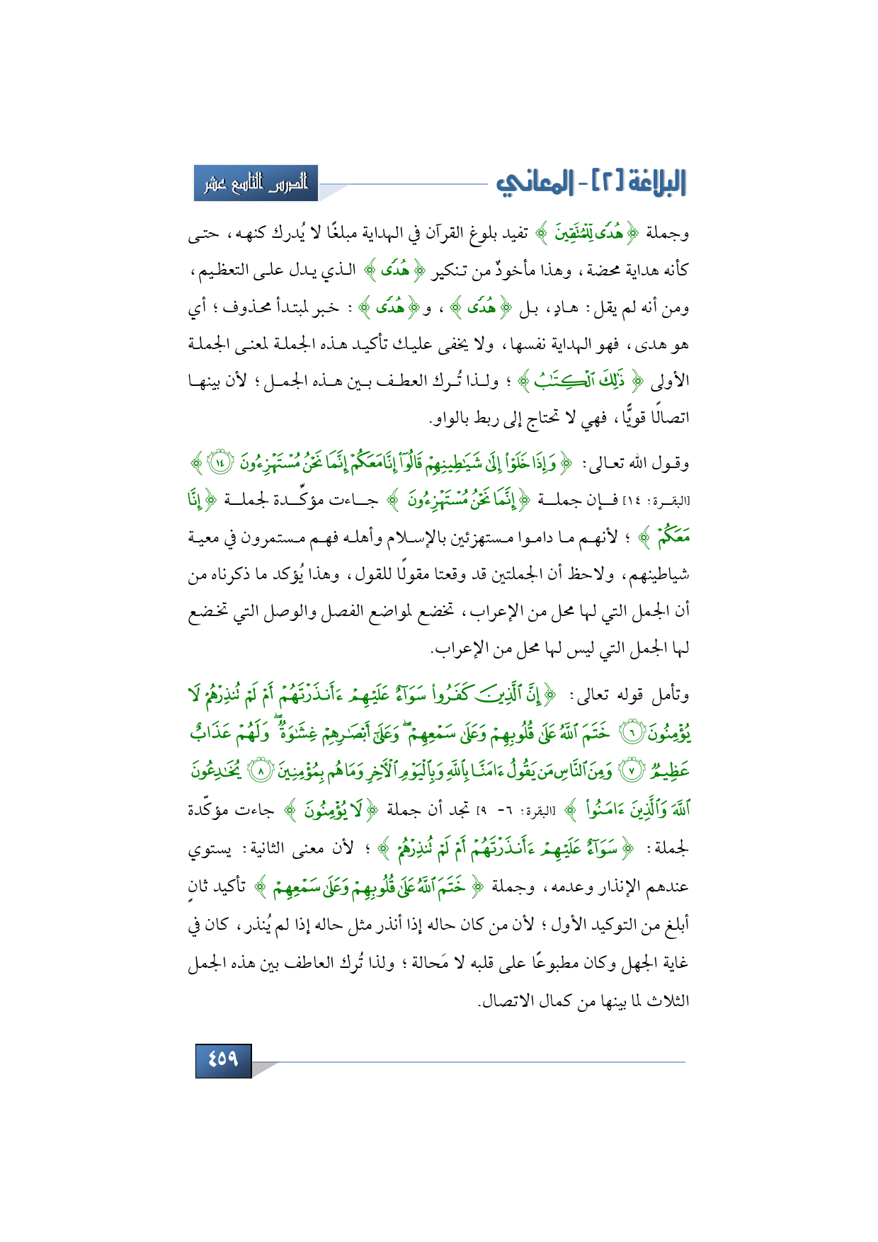وقول الله تعالى: {وَإِذَا خَلَوْا إِلَى شَيَاطِينِهِمْ قَالُوا إِنَّا مَعَكُمْ إِنَّمَا نَحْنُ مُسْتَهْزِئُونَ} (البقرة: 14)، فإنك ترى أن جملة {إِنَّمَا نَحْنُ مُسْتَهْزِئُونَ} جاءت مؤكِّدة لجملة {إِنَّا مَعَكُمْ}؛ لأنهم ما داموا مستهزئين بالإسلام وأهله فهم مستمرون في معية شياطينهم، ولاحظ أن الجملتين قد وقعتا مقولًا للقول، وهذا يُؤكد ما قلناه من أن الجمل التي لها محل من الإعراب، تخضع لمواضع الفصل والوصل التي تخضع لها الجمل التي ليس لها محل من الإعراب، وتأمل قوله تعالى: {إِنَّ الَّذِينَ كَفَرُوا سَوَاءٌ عَلَيْهِمْ أَأَنْذَرْتَهُمْ أَمْ لَمْ تُنْذِرْهُمْ لَا يُؤْمِنُونَ * خَتَمَ اللَّهُ عَلَى قُلُوبِهِمْ وَعَلَى سَمْعِهِمْ وَعَلَى أَبْصَارِهِمْ غِشَاوَةٌ وَلَهُمْ عَذَابٌ عَظِيمٌ * وَمِنَ النَّاسِ مَنْ يَقُولُ آمَنَّا بِاللَّهِ وَبِالْيَوْمِ الْآخِرِ وَمَا هُمْ بِمُؤْمِنِينَ * يُخَادِعُونَ اللَّهَ وَالَّذِينَ آمَنُوا} (البقرة: 6 - 9) تجد أن جملة {لَا يُؤْمِنُونَ} جاءت مؤكّدة لجملة: {سَوَاءٌ عَلَيْهِمْ أَأَنْذَرْتَهُمْ أَمْ لَمْ تُنْذِرْهُمْ}؛ لأن معنى الثانية: يستوي عندهم الإنذار وعدمه، وجملة {خَتَمَ اللَّهُ عَلَى قُلُوبِهِمْ وَعَلَى سَمْعِهِمْ} تأكيد ثانٍ أبلغ من التوكيد الأول؛ لأن من كان حاله إذا أنذر مثل حاله إذا لم يُنذر، كان في غاية الجهل وكان مطبوعًا على قلبه لا مَحالة؛ ولذا تُرك العاطف بين هذه الجمل الثلاث لما بينها من كمال الاتصال.