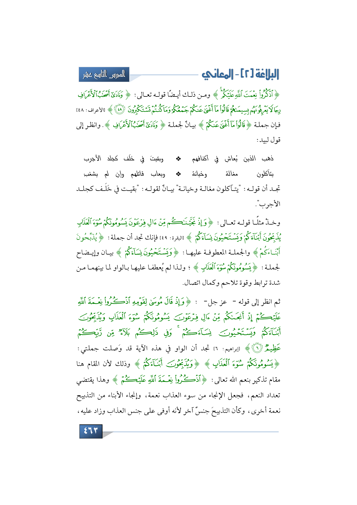 تجد أن قوله: "يتآكلون مغالة وخيانة" بيانٌ لقوله: "بقيت في خَلَف كجلد الأجرب". وخذْ مثلًا قوله تعالى: {وإِذْ نَجَّيْنَاكُمْ مِنْ آلِ فِرْعَوْنَ يَسُومُونَكُمْ سُوءَ الْعَذَابِ يُذَبِّحُونَ أَبْنَاءَكُمْ وَيَسْتَحْيُونَ نِسَاءَكُمْ} (البقرة: 49) فإنك تجد أن جملة {يُذَبِّحُونَ أَبْنَاءَكُمْ} والجملة المعطوفة عليها {وَيَسْتَحْيُونَ نِسَاءَكُمْ} بيان وإيضاح لجملة {يَسُومُونَكُمْ سُوءَ الْعَذَابِ}؛ ولذا لم يُعطفا عليها بالواو لما بينهما من شدة ترابط وقوة تلاحم وكمال اتصال.