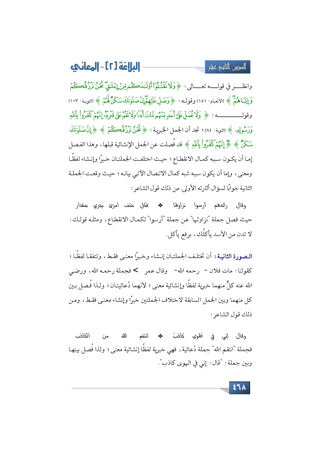 حيث فصل جملة "نزاولها" عن جملة "ارسوا" لكمال الانقطاع، ومثله قولك: لا تدن من الأسد يأكلُك، برفع يأكل. الصورة الثانية: أن تختلف الجملتان إنشاء وخبرًا معنى فقط، وتتفقا لفظًا؛ كقولنا: مات فلان -رحمه الله- وقال عمر -رضي الله عنه- فجملة رحمه الله، ورضي الله عنه كلٌّ منهما خبرية لفظًا وإنشائية معنى؛ لأنهما دُعائيتان؛ ولذا فُصل بين كل منهما وبين الجمل السابقة لاختلاف الجملتين خبرًا وإنشاء معنى فقط، ومن ذلك قول الشاعر: