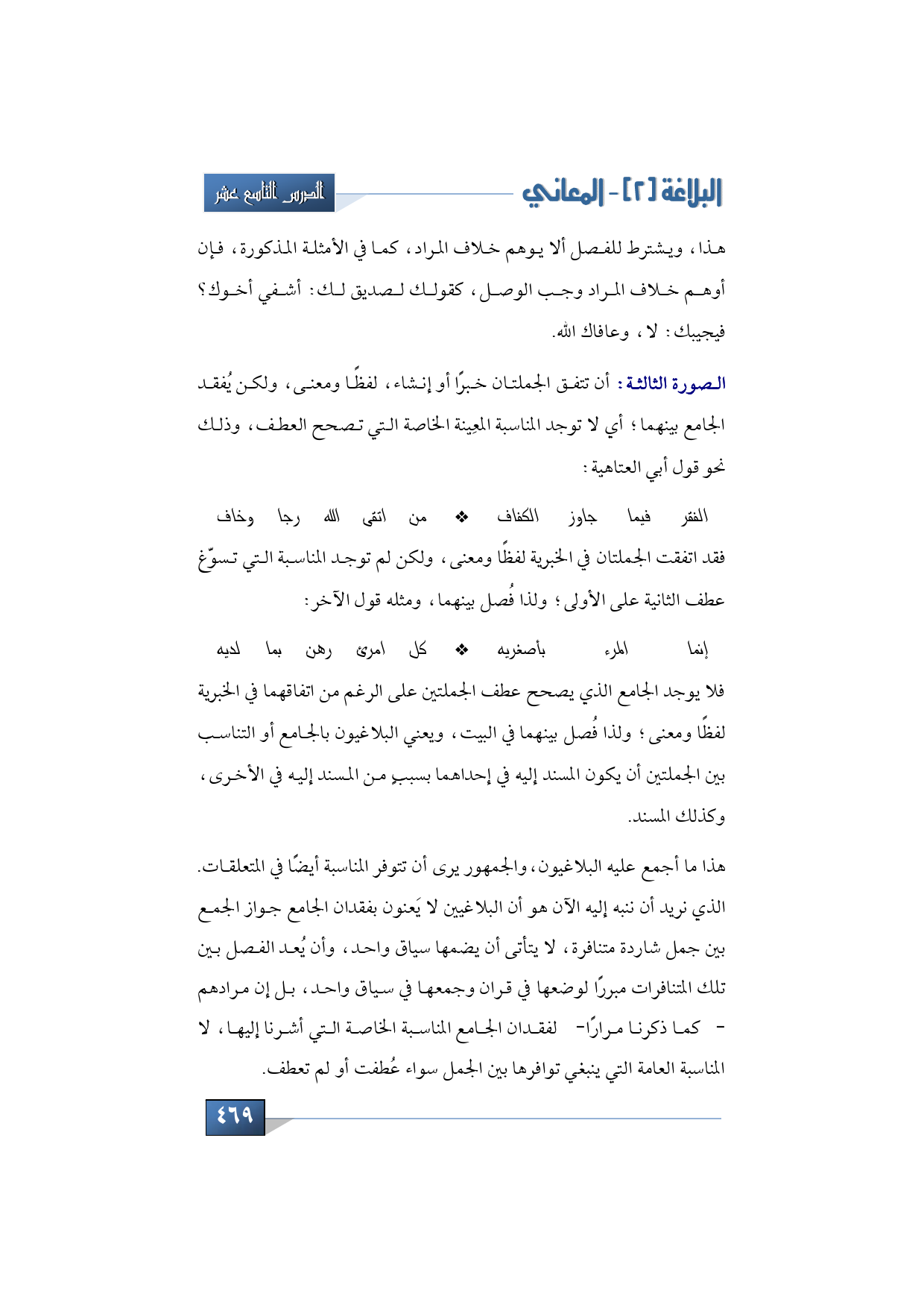 هذا ويشترط للفصل ألا يوهم خلاف المراد، كما في الأمثلة المذكورة، فإن أوهم خلاف المراد وجب الوصل، كقولك لصديق لك: أشفي أخوك؟ فيجيبك: لا، وعافاك الله. الصورة الثالثة: أن تتفق الجملتان خبرًا أو إنشاء، لفظًا ومعنى، ولكن يُفقد الجامع بينهما؛ أي لا توجد المناسبة المعِينة الخاصة التي تصحح العطف، وذلك نحو قول أبي العتاهية: