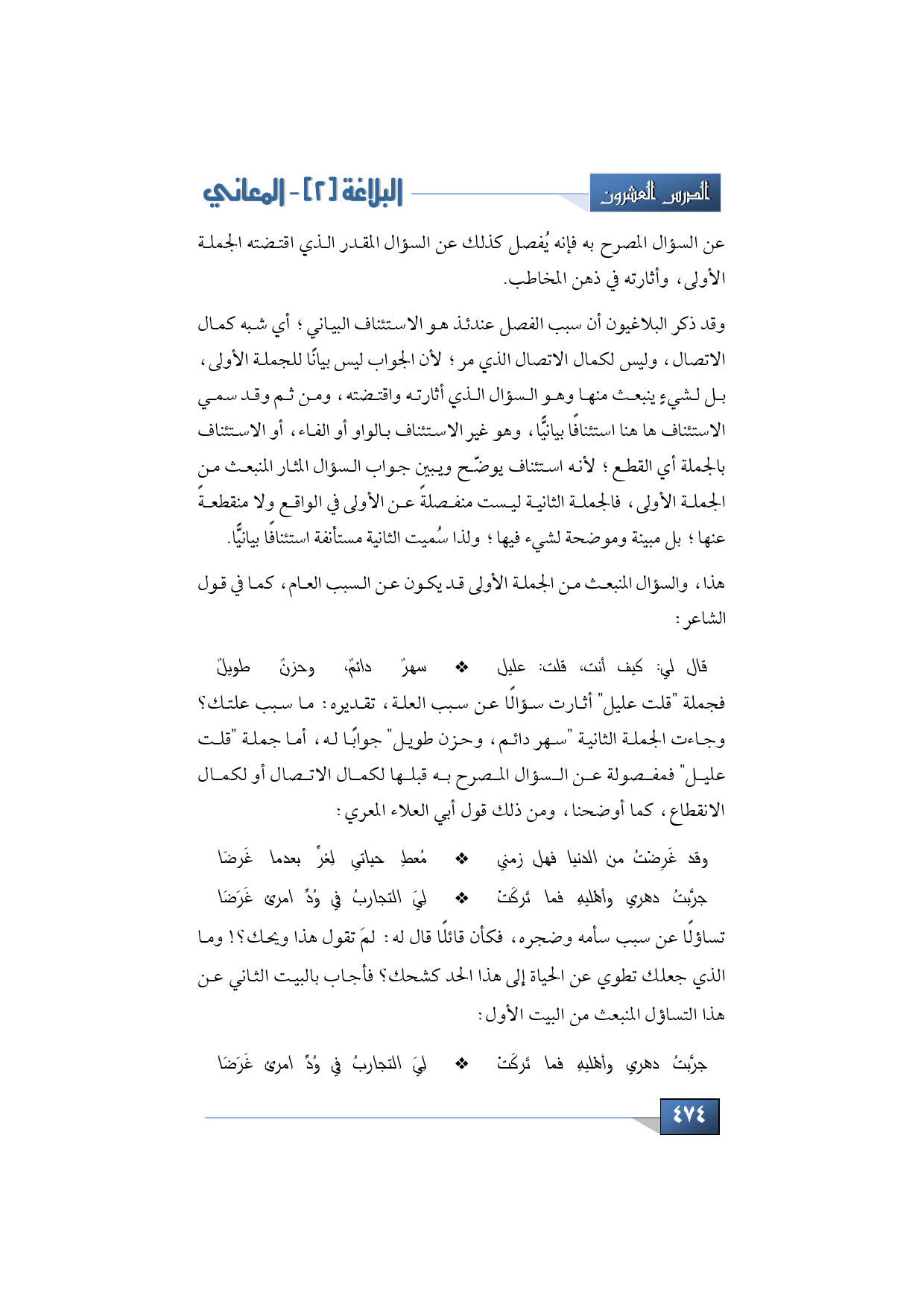 فجملة "قلت عليل" أثارت سؤالًا عن سبب العلة، تقديره: ما سبب علتك؟ وجاءت الجملة الثانية "سهر دائم وحزن طويل" جوابًا له، أما جملة "قلت عليل" فمفصولة عن السؤال المصرح به قبلها لكمال الاتصال أو لكمال الانقطاع، كما أوضحنا، ومن ذلك قول أبي العلاء المعري: