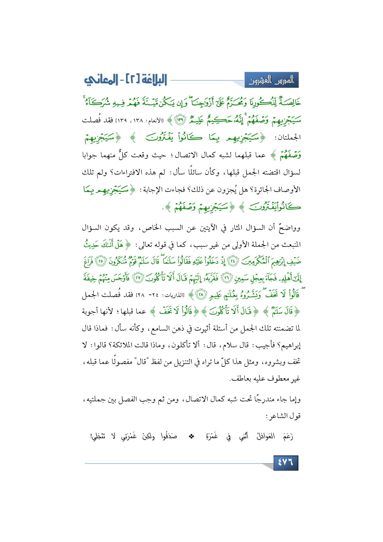 خَالِصَةٌ لِذُكُورِنَا وَمُحَرَّمٌ عَلَى أَزْوَاجِنَا وَإِنْ يَكُنْ مَيْتَةً فَهُمْ فِيهِ شُرَكَاءُ سَيَجْزِيهِمْ وَصْفَهُمْ إِنَّهُ حَكِيمٌ عَلِيمٌ} (الأنعام: 138، 139) فقد فُصلت الجملتان {سَيَجْزِيهِمْ بِمَا كَانُوا يَفْتَرُونَ} {سَيَجْزِيهِمْ وَصْفَهُمْ} عما قبلهما لشبه كمال الاتصال؛ حيث وقعت كلٌّ منهما جوابا لسؤال اقتضته الجمل قبلها، وكأن سائلًا سأل: لم هذه الافتراءات؟ ولم تلك الأوصاف الجائرة؟ هل يُجزون عن ذلك؟ فجاءت الإجابة: {سَيَجْزِيهِمْ بِمَا كَانُوا يَفْتَرُونَ} {سَيَجْزِيهِمْ وَصْفَهُمْ}.
