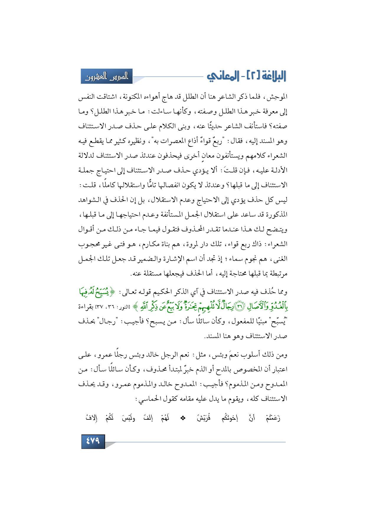 الموحِش، فلما ذكر الشاعر هنا أن الطلل قد هاج أهواءه المكنونة، اشتاقت النفس إلى معرفة خبر هذا الطلل وصفته، وكأنها ساءلت: ما خبر هذا الطلل؟ وما صفته؟ فاستأنف الشاعر حديثًا عنه، وبنى الكلام على حذف صدر الاستئناف وهو المسند إليه، فقال: "ربعٌ قواءٌ أذاع المعصرات به"، ونظيره كثير مما يقطع فيه الشعراء كلامهم ويستأنفون معانٍ أخرى فيحذفون عندئذ صدر الاستئناف لدلالة الأدلة عليه، فإن قلتَ: ألا يؤدي حذف صدر الاستئناف إلى احتياج جملة الاستئناف إلى ما قبلها؟ وعندئذ لا يكون انفصالها تامًّا واستقلالها كاملًا، قلت: ليس كل حذف يؤدي إلى الاحتياج وعدم الاستقلال، بل إن الحذف في الشواهد المذكورة قد ساعد على استقلال الجمل المستأنفة وعدم احتياجها إلى ما قبلها، ويتضح لك هذا عندما تقدر المحذوف فتقول فيما جاء من ذلك من أقوال الشعراء: ذاك ربع قواء، تلك دار لمروة، هم بناة مكارم، هو فتى غير محجوب الغنى، هم نجوم سماء، إذ تجد أن اسم الإشارة والضمير قد جعل تلك الجمل مرتبطة بما قبلها محتاجة إليه، أما الحذف فيجعلها مستقلة عنه.