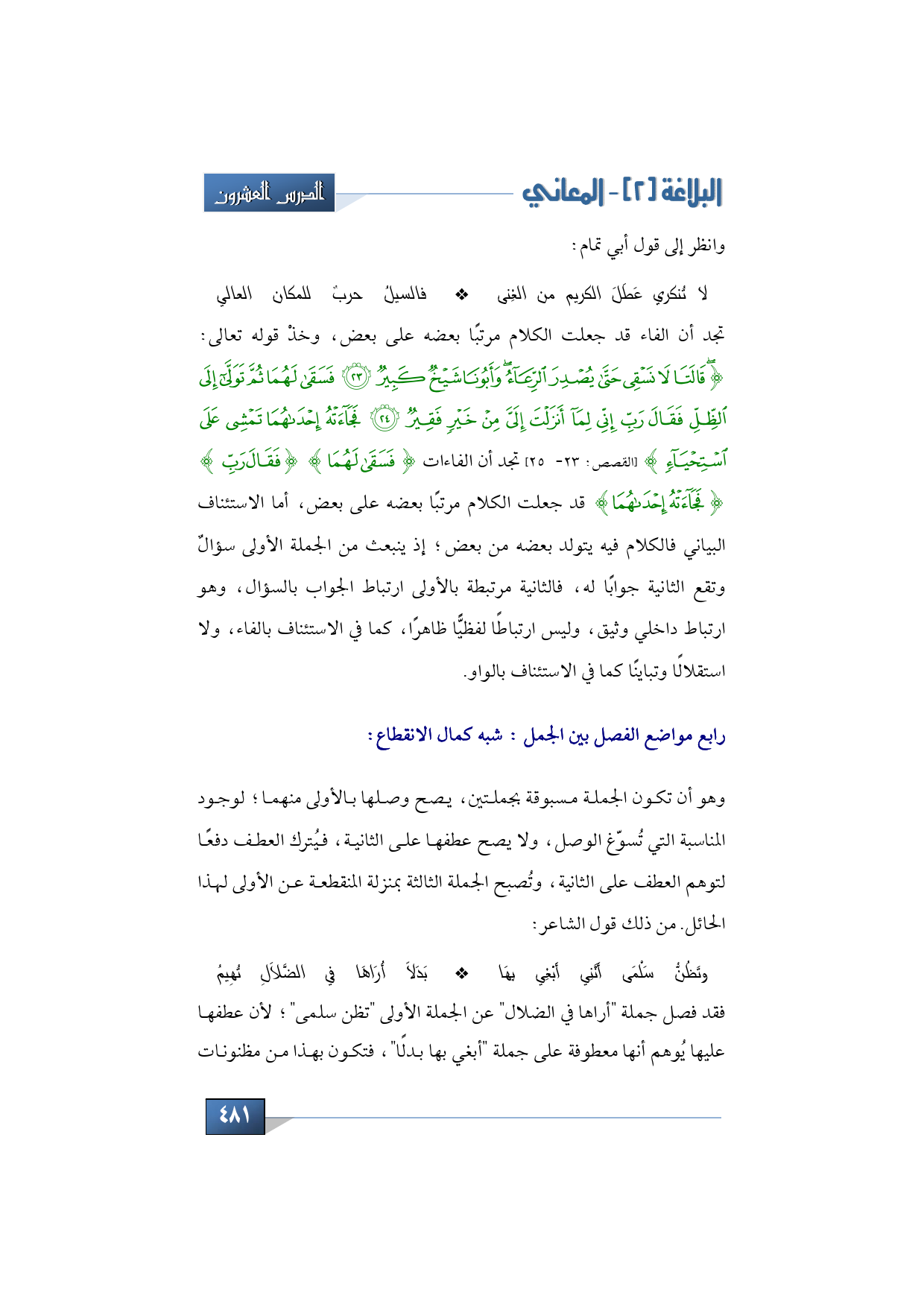 رابع مواضع الفصل بين الجمل: شبه كمال الانقطاع، وقد عرفوه بقولهم: أن تكون الجملة مسبوقة بجملتين، يصح وصلها بالأولى منهما؛ لوجود المناسبة التي تُسوّغ الوصل، ولا يصح عطفها على الثانية، فيُترك العطف دفعًا لتوهم العطف على الثانية، وتُصبح الجملة الثالثة بمنزلة المنقطعة عن الأولى لهذا الحائل. من ذلك قول الشاعر: