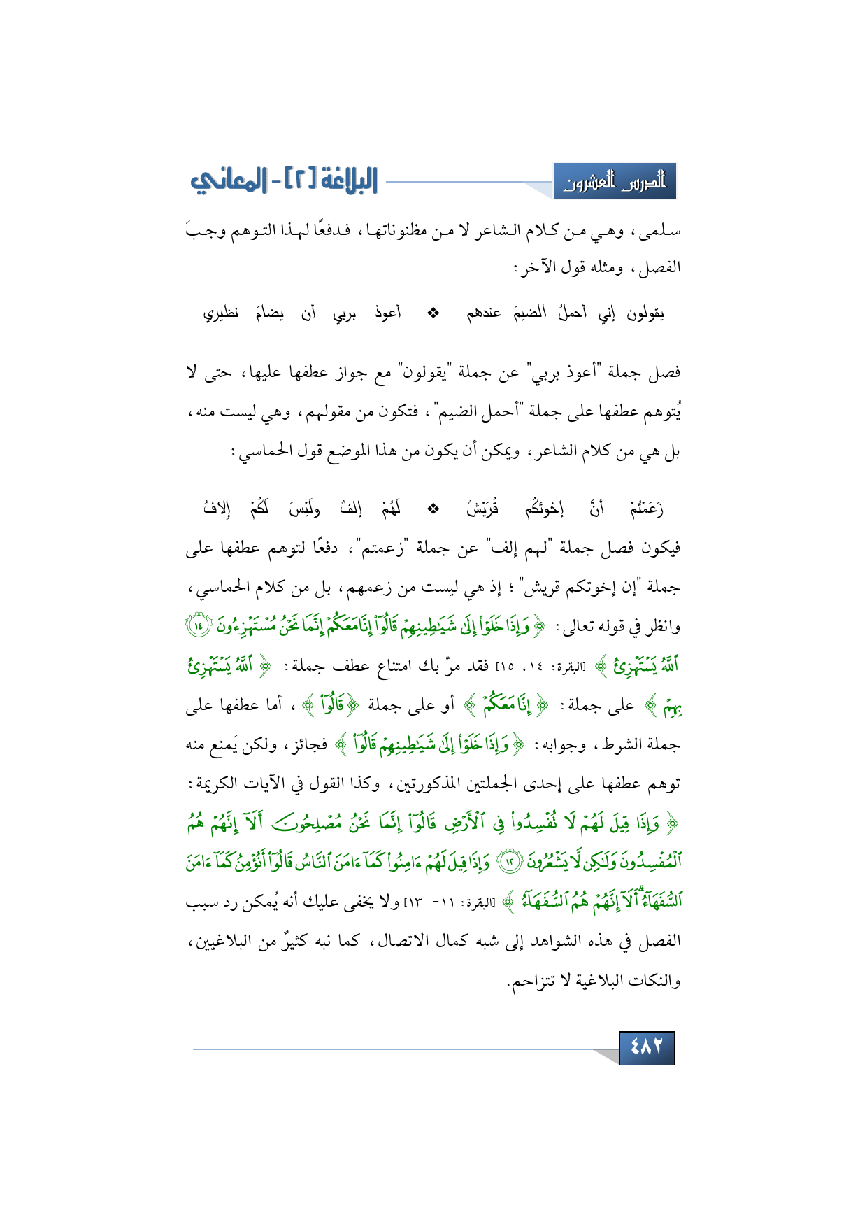 فيكون فصل جملة "لهم إلف" عن جملة "زعمتم"، دفعًا لتوهم عطفها على جملة "إن إخوتكم قريش"؛ إذ هي ليست من زعمهم، بل من كلام الحماسي، وانظر في قوله تعالى: {وَإِذَا خَلَوْا إِلَى شَيَاطِينِهِمْ قَالُوا إِنَّا مَعَكُمْ إِنَّمَا نَحْنُ مُسْتَهْزِئُونَ * اللَّهُ يَسْتَهْزِئُ بِهِمْ} (البقرة: 14، 15) فقد مرّ بك امتناع عطف جملة {اللَّهُ يَسْتَهْزِئُ بِهِمْ} على جملة {إِنَّا مَعَكُمْ} أو على جملة {قَالُوا}، أما عطفها على جملة الشرط، وجوابه {وَإِذَا خَلَوْا إِلَى شَيَاطِينِهِمْ قَالُوا} فجائز، ولكن يَمنع منه توهم عطفها على إحدى الجملتين المذكورتين، وكذا القول في الآيات الكريمة: {وَإِذَا قِيلَ لَهُمْ لَا تُفْسِدُوا فِي الْأَرْضِ قَالُوا إِنَّمَا نَحْنُ مُصْلِحُونَ * أَلَا إِنَّهُمْ هُمُ الْمُفْسِدُونَ وَلَكِنْ لَا يَشْعُرُونَ * وَإِذَا قِيلَ لَهُمْ آمِنُوا كَمَا آمَنَ النَّاسُ قَالُوا أَنُؤْمِنُ كَمَا آمَنَ السُّفَهَاءُ أَلَا إِنَّهُمْ هُمُ السُّفَهَاءُ} (البقرة: 11 - 13) ولا يخفى عليك أنه يُمكن رد سبب الفصل في هذه الشواهد إلى شبه كمال الاتصال، كما نبه كثيرٌ من البلاغيين، والنكات البلاغية لا تتزاحم.