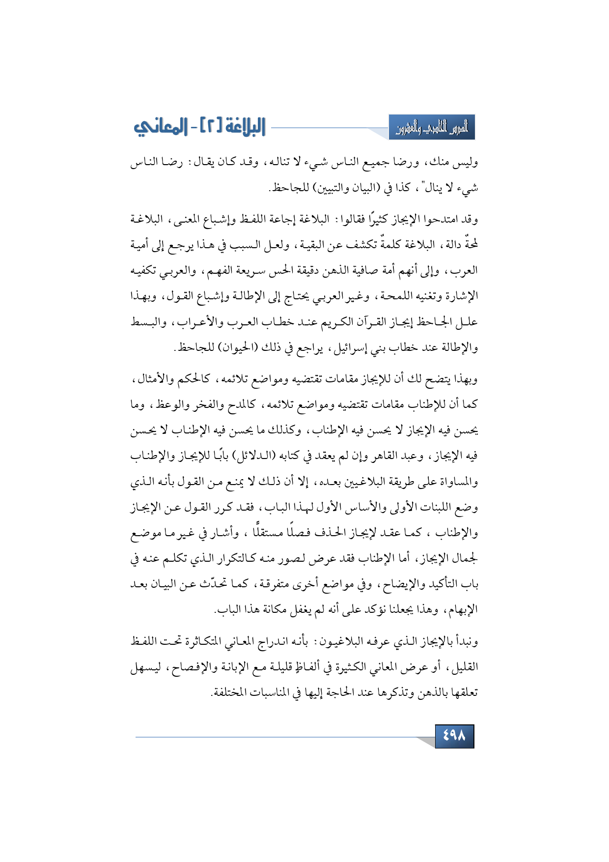 ونبدأ بالإيجاز الذي عرفه البلاغيون: بأنه اندراج المعاني المتكاثرة تحت اللفظ القليل، أو عرض المعاني الكثيرة في ألفاظٍ قليلة مع الإبانة والإفصاح، ليسهل تعلقها بالذهن وتذكرها عند الحاجة إليها في المناسبات المختلفة،