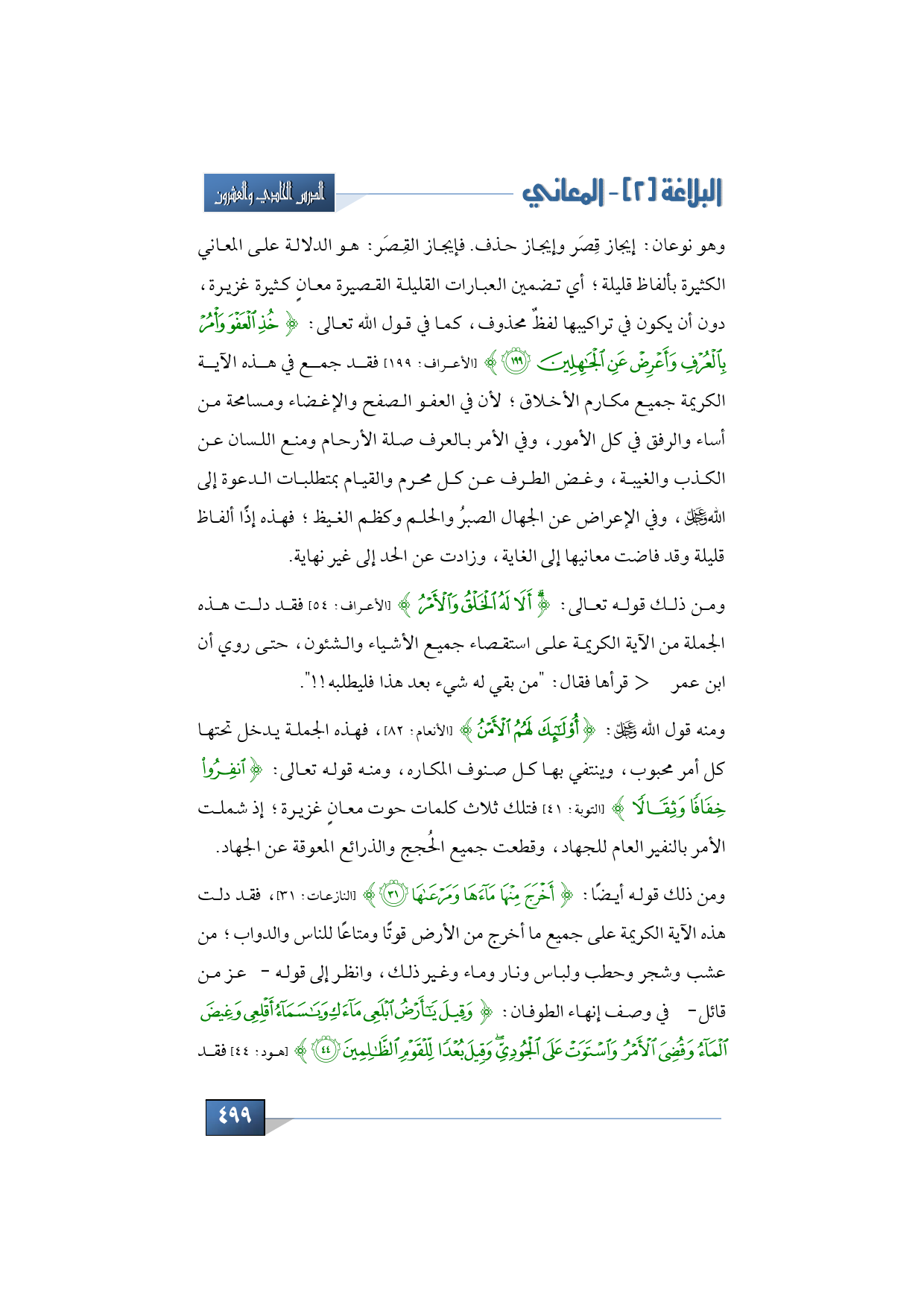 وهو نوعان: إيجاز قِصَر وإيجاز حذف. فإيجاز القِصَر: هو الدلالة على المعاني الكثيرة بألفاظ قليلة؛ أي تضمين العبارات القليلة القصيرة معانٍ كثيرة غزيرة، دون أن يكون في تراكيبها لفظٌ محذوف، كما في قول الله تعالى: {خُذِ الْعَفْوَ وَأْمُرْ بِالْعُرْفِ وَأَعْرِضْ عَنِ الْجَاهِلِينَ} (الأعراف: 199) فقد جمع في هذه الآية الكريمة جميع مكارم الأخلاق؛ لأن في العفو الصفح والإغضاء ومسامحة من أساء والرفق في كل الأمور، وفي الأمر بالعرف صلة الأرحام ومنع اللسان عن الكذب والغيبة، وغض الطرف عن كل محرم والقيام بمتطلبات الدعوة إلى الله عز وجل، وفي الإعراض عن الجهال الصبرُ والحلم وكظم الغيظ؛ فهذه إذن ألفاظ قليلة وقد فاضت معانيها إلى الغاية، وزادت عن الحد إلى غير نهاية، ومن ذلك قوله تعالى: {أَلَا لَهُ الْخَلْقُ وَالْأَمْرُ} (الأعراف: 54) فقد دلت هذه الجملة من الآية الكريمة على استقصاء جميع الأشياء والشئون، حتى روي أن ابن عمر -رضي الله عنهما- قرأها فقال: "من بقي له شيء بعد هذا فليطلبه!! ".