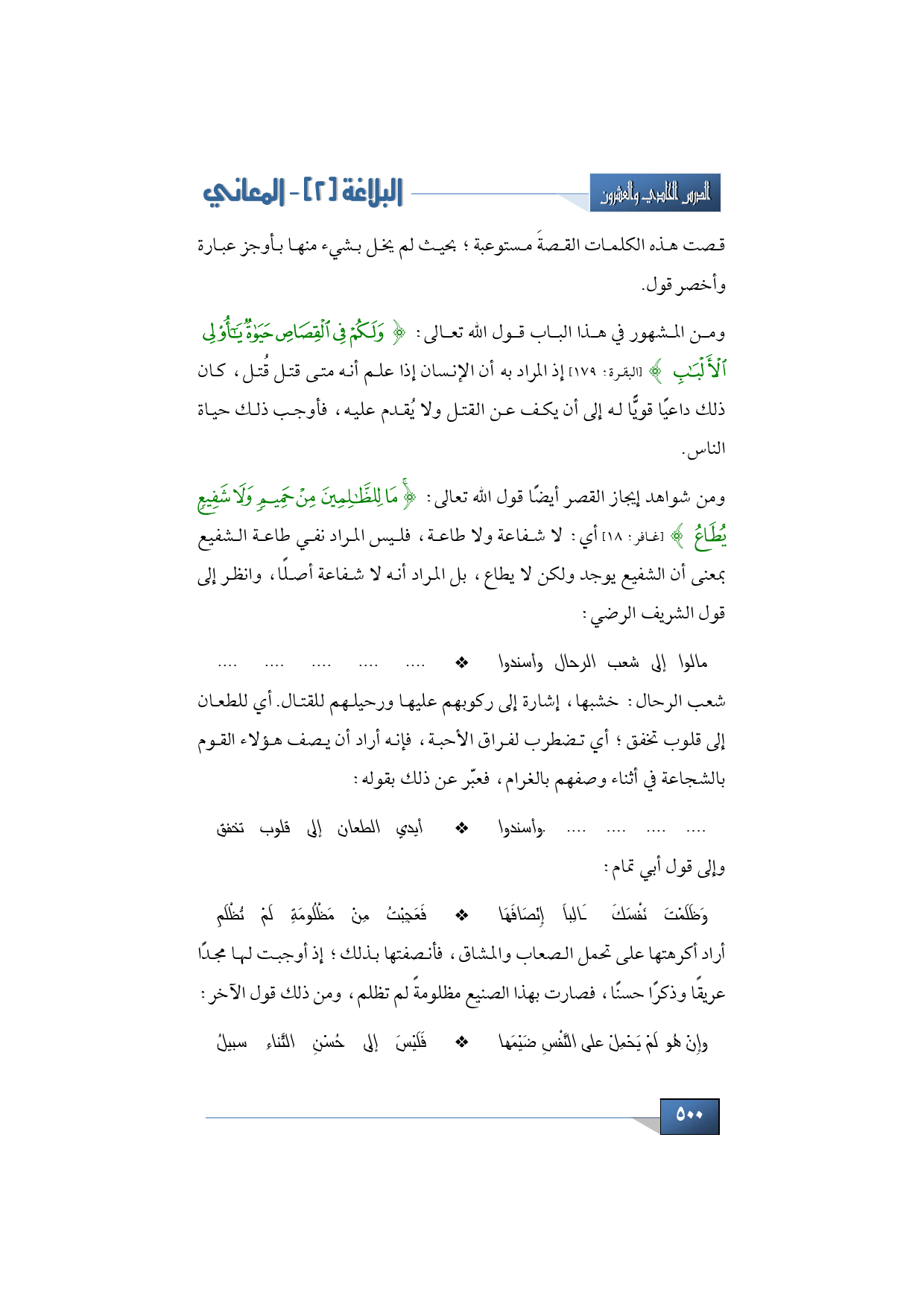 ومن المشهور في هذا الباب قول الله تعالى: {وَلَكُمْ فِي الْقِصَاصِ حَيَاةٌ يَا أُولِي الْأَلْبَابِ} (البقرة: 179) إذ المراد به أن الإنسان إذا علم أنه متى قتل قُتل، كان ذلك داعيًا قويًّا له إلى أن يكف عن القتل ولا يُقدم عليه، فأوجب ذلك حياة الناس، ومن شواهد إيجاز القصر أيضًا قول الله تعالى: {مَا لِلظَّالِمِينَ مِنْ حَمِيمٍ وَلَا شَفِيعٍ يُطَاعُ} (غافر: 18) أي: لا شفاعة ولا طاعة، فليس المراد نفي طاعة الشفيع بمعنى أن الشفيع يوجد ولكن لا يطاع، بل المراد أنه لا شفاعة أصلًا، وانظر إلى قول الشريف الرضي: