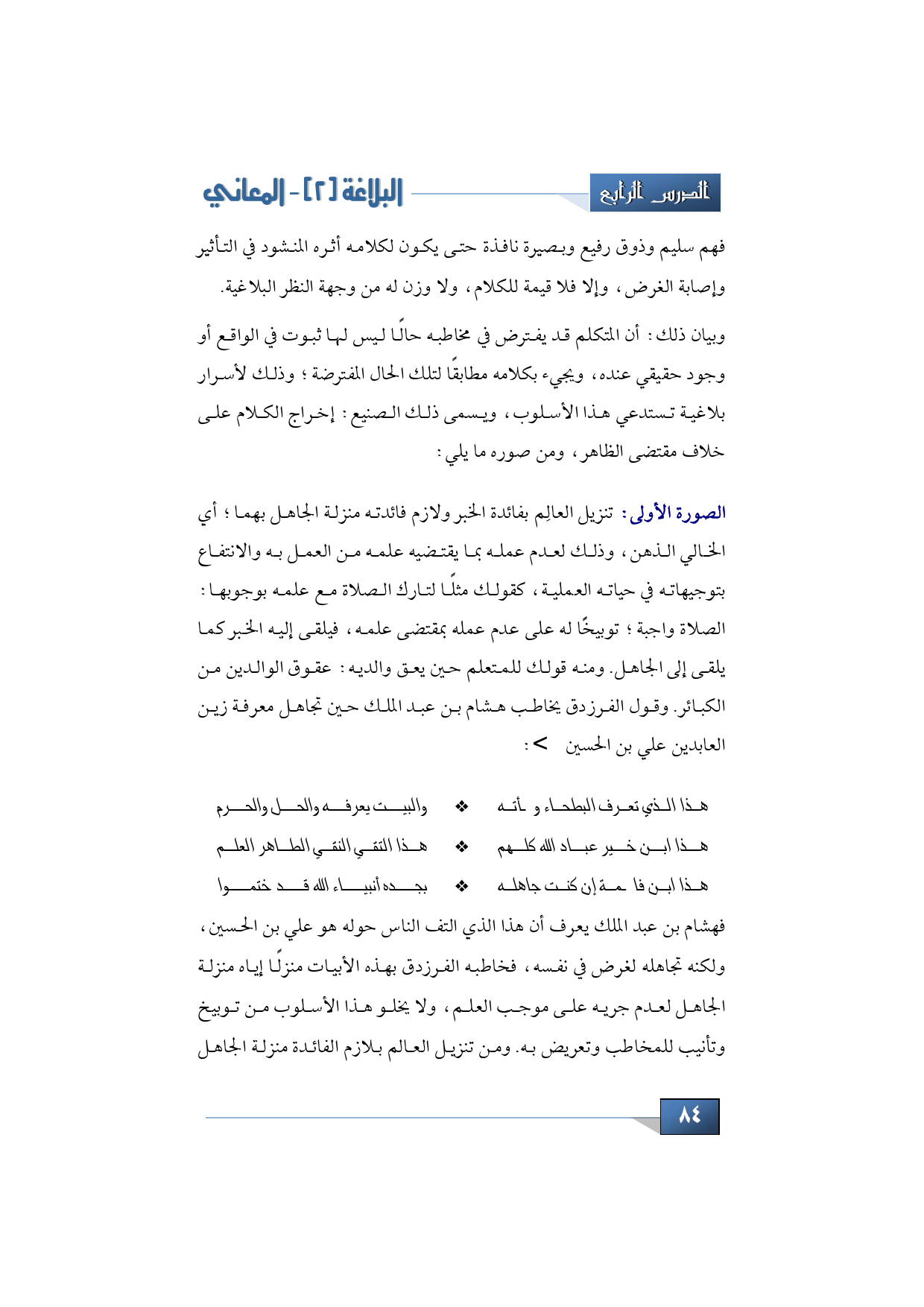 فهشام بن عبد الملك يعرف أن هذا الذي التف الناس حوله هو علي بن الحسين، ولكنه تجاهله لغرض في نفسه، فخاطبه الفرزدق بهذه الأبيات منزلًا إياه منزلة الجاهل لعدم جريه على موجب العلم، ولا يخلو هذا الأسلوب من توبيخ وتأنيب للمخاطب وتعريض به. ومن تنزيل العالم بلازم الفائدة منزلة الجاهل