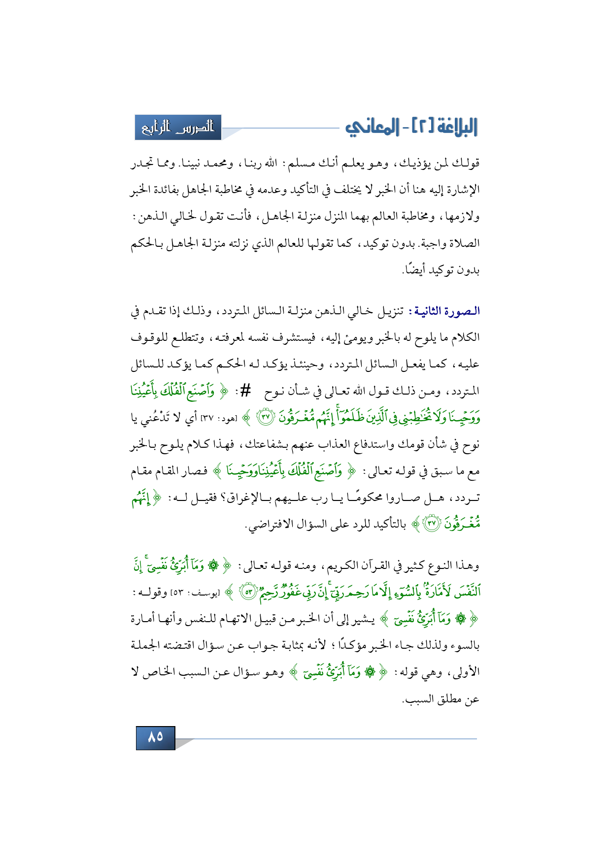 الصورة الثانية: تنزيل خالي الذهن منزلة السائل المتردد، وذلك إذا تقدم في الكلام ما يلوح له بالخبر ويومئ إليه، فيستشرف نفسه لمعرفته، وتتطلع للوقوف عليه، كما يفعل السائل المتردد، وحينئذ يؤكد له الحكم كما يؤكد للسائل المتردد، ومن ذلك قول الله تعالى في شأن نوح -عليه السلام: {وَاصْنَعِ الْفُلْكَ بِأَعْيُنِنَا وَوَحْيِنَا وَلَا تُخَاطِبْنِي فِي الَّذِينَ ظَلَمُوا إِنَّهُمْ مُغْرَقُونَ} (هود: 37) أي لا تدعني يا نوح في شأن قومك واستدفاع العذاب عنهم بشفاعتك، فهذا كلام يلوح بالخبر مع ما سبق في قوله تعالى: {وَاصْنَعِ الْفُلْكَ بِأَعْيُنِنَا وَوَحْيِنَا} فصار المقام مقام تردد، هل صاروا محكومًا يا رب عليهم بالإغراق؟ فقيل له: {إِنَّهُمْ مُغْرَقُونَ} بالتأكيد للرد على السؤال الافتراضي، وهذا النوع كثير في القرآن الكريم. ومنه قوله تعالى: {وَمَا أُبَرِّئُ نَفْسِي إِنَّ النَّفْسَ لَأَمَّارَةٌ بِالسُّوءِ إِلَّا مَا رَحِمَ رَبِّي إِنَّ رَبِّي غَفُورٌ رَحِيمٌ} (يوسف: 53) وقوله: {وَمَا أُبَرِّئُ نَفْسِي} يشير إلى أن الخبر من قبيل الاتهام للنفس وأنها أمارة بالسوء ولذلك جاء الخبر مؤكدًا؛ لأنه بمثابة جواب عن سؤال اقتضته الجملة الأولى، وهي قوله: {وَمَا أُبَرِّئُ نَفْسِي} وهو سؤال عن السبب الخاص لا عن مطلق السبب.