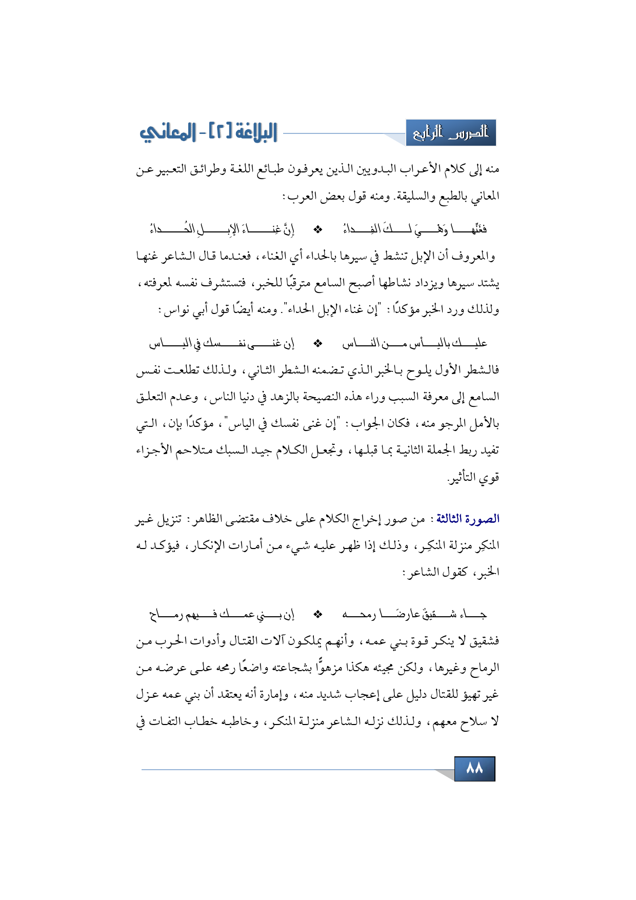 فالشطر الأول يلوح بالخبر الذي تضمنه الشطر الثاني، ولذلك تطلعت نفس السامع إلى معرفة السبب وراء هذه النصيحة بالزهد في دنيا الناس، وعدم التعلق بالأمل المرجو منه، فكان الجواب: "إن غنى نفسك في الياس"، مؤكدًا بإن، التي تفيد ربط الجملة الثانية بما قبلها، وتجعل الكلام جيد السبك متلاحم الأجزاء قوي التأثير. الصورة الثالثة من صور إخراج الكلام على خلاف مقتضى الظاهر: تنزيل غير المنكِر منزلة المنكِر، وذلك إذا ظهر عليه شيء من أمارات الإنكار، فيؤكد له الخبر، كقول الشاعر: