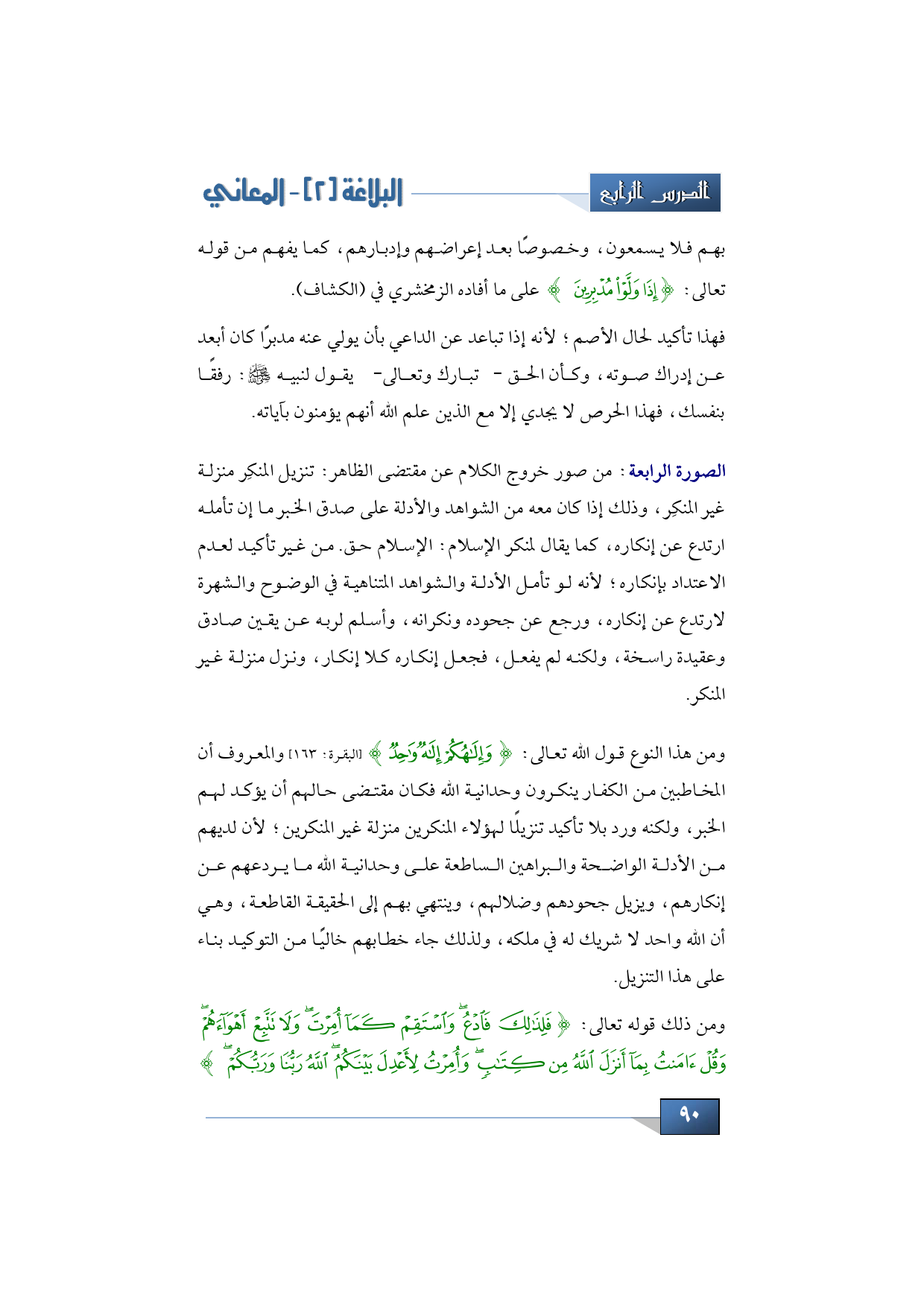 ومن هذا النوع قول الله تعالى: {وَإِلَهُكُمْ إِلَهٌ وَاحِدٌ} (البقرة: 163) والمعروف أن المخاطبين من الكفار ينكرون وحدانية الله فكان مقتضى حالهم أن يؤكد لهم الخبر، ولكنه ورد بلا تأكيد تنزيلًا لهؤلاء المنكرين منزلة غير المنكرين؛ لأن لديهم من الأدلة الواضحة والبراهين الساطعة على وحدانية الله ما يردعهم عن إنكارهم، ويزيل جحودهم وضلالهم، وينتهي بهم إلى الحقيقة القاطعة، وهي أن الله واحد لا شريك له في ملكه، ولذلك جاء خطابهم خاليًا من التوكيد بناء على هذا التنزيل. وتأمل قوله تعالى: {فَلِذَلِكَ فَادْعُ وَاسْتَقِمْ كَمَا أُمِرْتَ وَلَا تَتَّبِعْ أَهْوَاءَهُمْ وَقُلْ آمَنْتُ بِمَا أَنْزَلَ اللَّهُ مِنْ كِتَابٍ وَأُمِرْتُ لِأَعْدِلَ بَيْنَكُمُ اللَّهُ رَبُّنَا وَرَبُّكُمْ}