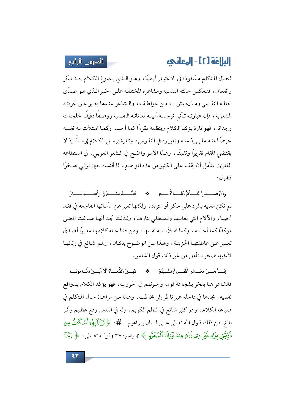 فالشاعر هنا يفخر بشجاعة قومه وخبرتهم في الحروب، فهو يؤكد الكلام بدوافع نفسية، يجدها في داخله غير ناظر إلى مخاطب، وهذا من مراعاة حال المتكلم في صياغة الكلام، وهو كثير شائع في النظم الكريم، وله في النفس وقع عظيم وأثر بالغ. من ذلك قول الله تعالى على لسان إبراهيم -عليه السلام: {رَبَّنَا إِنِّي أَسْكَنْتُ مِنْ ذُرِّيَّتِي بِوَادٍ غَيْرِ ذِي زَرْعٍ عِنْدَ بَيْتِكَ الْمُحَرَّمِ} (إبراهيم: 37) وقوله تعالى: {رَبَّنَا
