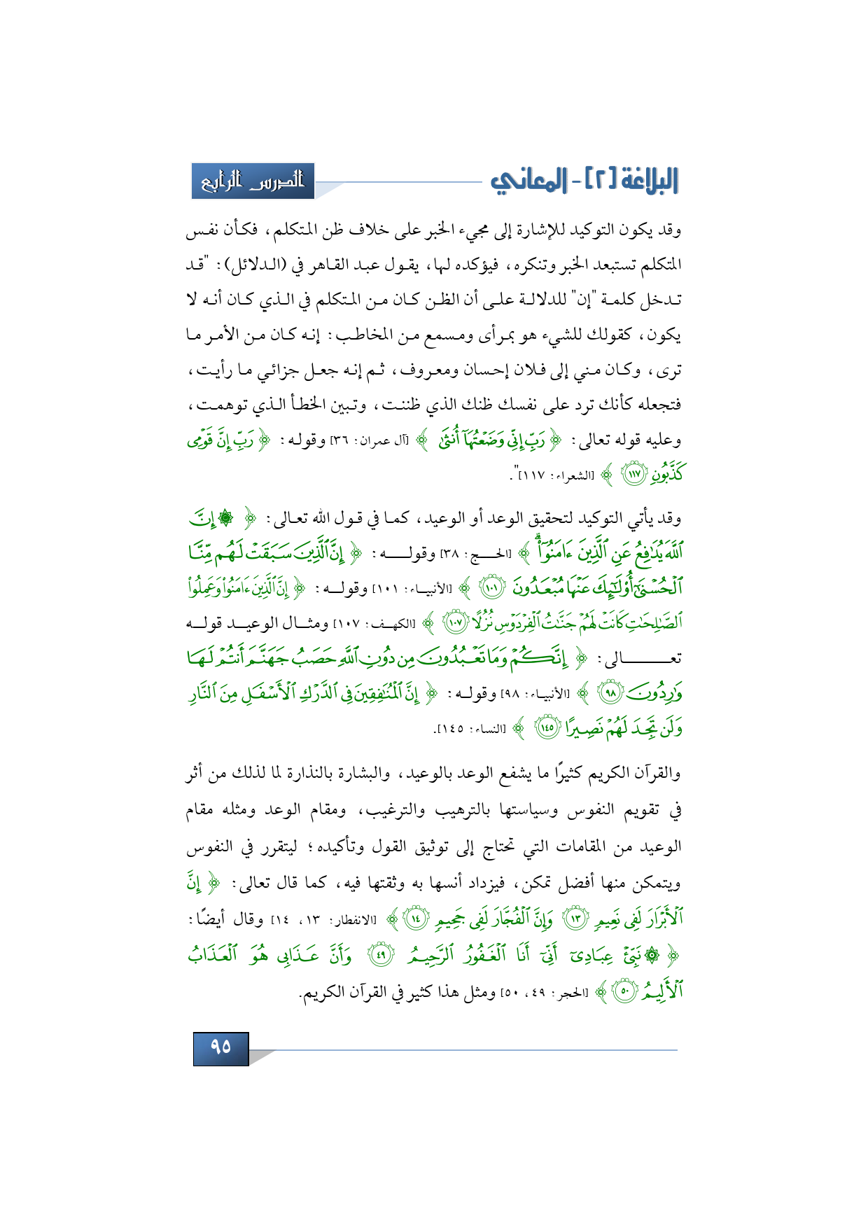 والقرآن الكريم كثيرًا ما يشفع الوعد بالوعيد، والبشارة بالنذارة لما لذلك من أثر في تقويم النفوس وسياستها بالترهيب والترغيب، ومقام الوعد ومثله مقام الوعيد من المقامات التي تحتاج إلى توثيق القول وتأكيده؛ ليتقرر في النفوس ويتمكن منها فضل تمكن، فيزداد أنسها به وثقتها فيه، كما قال تعالى: {إِنَّ الْأَبْرَارَ لَفِي نَعِيمٍ * وَإِنَّ الْفُجَّارَ لَفِي جَحِيمٍ} (الانفطار: 13، 14) وقال أيضًا: {نَبِّئْ عِبَادِي أَنِّي أَنَا الْغَفُورُ الرَّحِيمُ * وَأَنَّ عَذَابِي هُوَ الْعَذَابُ الْأَلِيمُ} (الحجر: 49، 50) ومثل هذا كثير في القرآن الكريم.