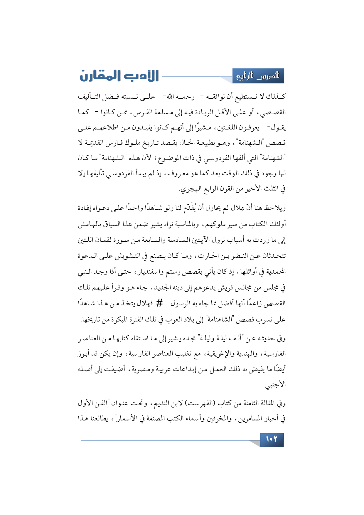 كذلك لا نستطيع أن نوافقه -رحمه الله- على نسبته فضل التأليف القصصي، أو على الأقل الريادة فيه إلى مسلمة الفرس، ممن كانوا -كما يقول- يعرفون اللغتين، مشيرًا إلى أنهم كانوا يفيدون من اطلاعهم على قصص "الشهنامة"، وهو بطبيعة الحال يقصد تاريخ ملوك فارس القديمة لا "الشهنامة" التي ألفها الفردوسي في ذات الموضوع؛ لأن هذه "الشهنامة" ما كان لها وجود في ذلك الوقت بعد كما هو معروف، إذ لم يبدأ الفردوسي تأليفها إلا في الثلث الأخير من القرن الرابع الهجري.