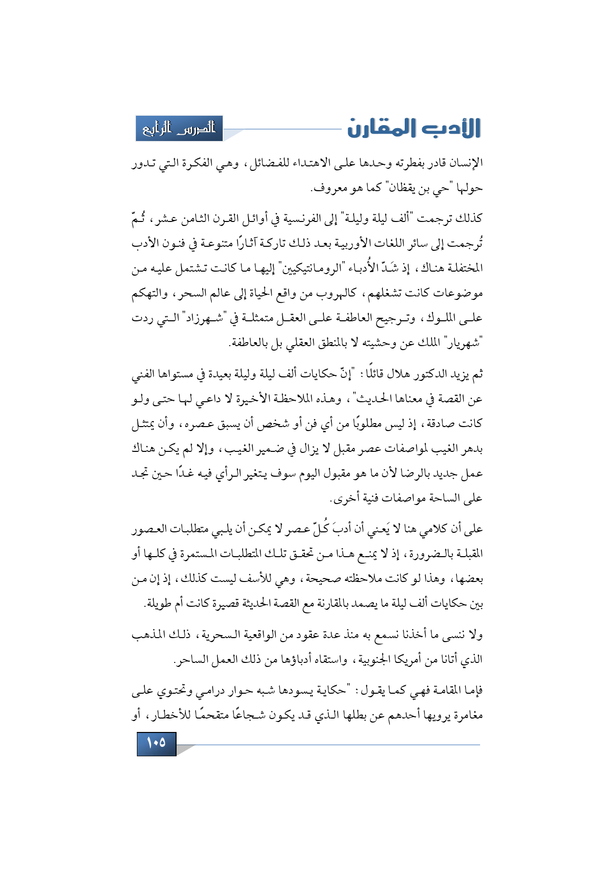 على أن كلامي هنا لا يَعني أن أدبَ كُلّ عصر لا يمكن أن يلبي متطلبات العصور المقبلة بالضرورة، إذ لا يمنع هذا من تحقق تلك المتطلبات المستمرة في كلها أو بعضها، وهذا لو كانت ملاحظته صحيحة، وهي للأسف ليست كذلك، إذ إن من بين حكايات ألف ليلة ما يصمد بالمقارنة مع القصة الحديثة قصيرة كانت أم طويلة.