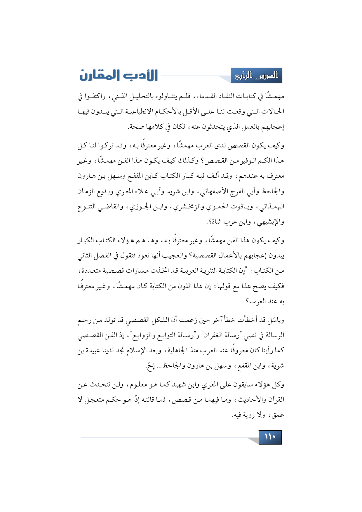 وكيف يكون القصص لدى العرب مهمشًا، وغير معترفًا به، وقد تركوا لنا كل هذا الكم الوفير من القصص؟ وكذلك كيف يكون هذا الفن مهمشًا، وغير معترف به عندهم، وقد ألف فيه كبار الكتاب كابن المقفع وسهل بن هارون والجاحظ وأبي الفرج الأصفهاني، وابن شريد وأبي علاء المعري وبديع الزمان الهمذاني، وياقوت الحموي والزمخشري، وابن الجوزي، والقاضي التنوح والإبشيهي، وابن عرب شاة؟.