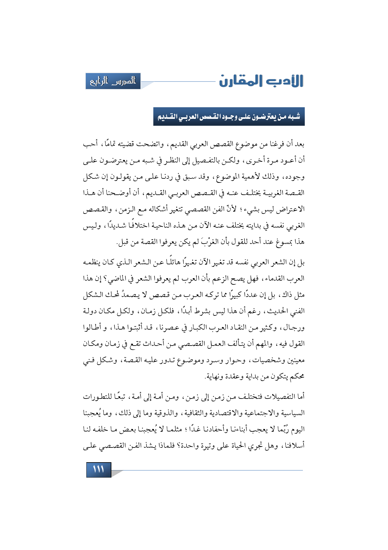 والآن بعد أن فرغنا من موضوع القصص العربي القديم، واتضحت قضيته تمامًا، أحب أن أعود مرة أخرى، ولكن بالتفصيل إلى النظر في شبه ما يعترضون على وجوده، وذلك لأهمية الموضوع، وقد سبق في ردنا على من يقولون إن شكل القصة الغربية يختلف عنه في القصص العربي القديم، أن أوضحنا أن هذا الاعتراض ليس بشيء؛ لأنّ الفن القصصي تتغير أشكاله مع الزمن، والقصص الغربي نفسه في بدايته يختلف عنه الآن من هذه الناحية اختلافًا شديدًا، وليس هذا بمسوغ عند أحد للقول بأن الغرْبَ لم يكن يعرفوا القصة من قبل.