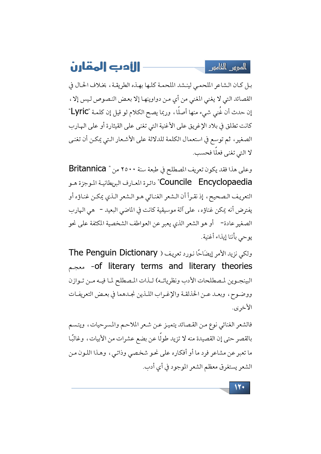 وعلى هذا فقد يكون تعريف المصطلح في طبعة سنة 2500 من " Britannica Councile Encyclopaedia" دائرة المعارف البريطانية الموجزة هو التعريف الصحيح، إذ نقرأ أن الشعر الغنائي هو الشعر الذي يمكن غناؤه أو يفترض أنه يمكن غناؤه، على آلة موسيقية كانت في الماضي البعيد -هي الهارب الصغير عادة- أو هو الشعر الذي يعبر عن العواطف الشخصية المكثفة على نحو يوحي بأننا إيذاء أغنية.