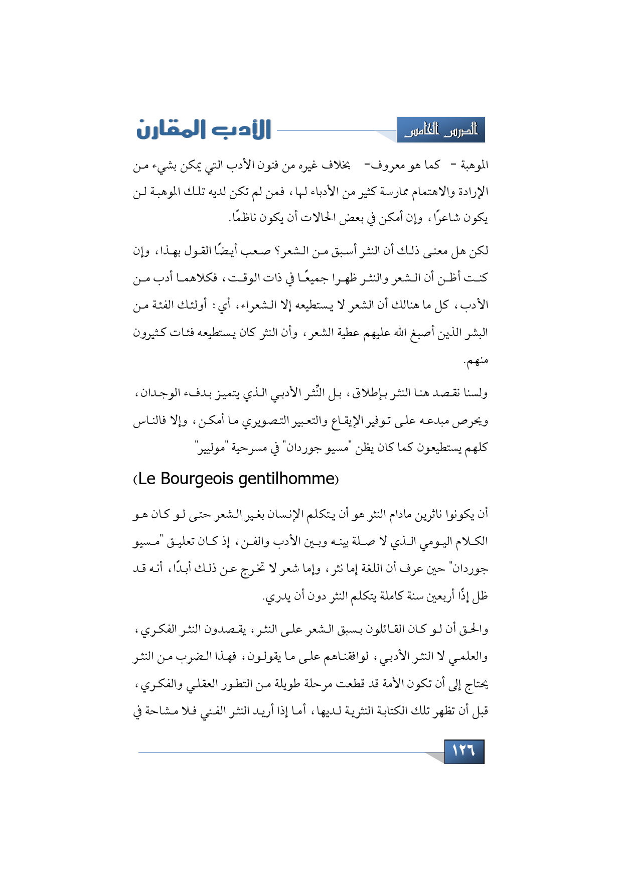 ولسنا نقصد هنا النثر بإطلاق، بل النِّثر الأدبي الذي يتميز بدفء الوجدان، ويحرص مبدعه على توفير الإيقاع والتعبير التصويري ما أمكن، وإلا فالناس كلهم يستطيعون كما كان يظن "مسيو جوردان" في مسرحية "موليير" ( Le Bourgeois gentilhomme) أن يكونوا ناثرين مادام النثر هو أن يتكلم الإنسان بغير الشعر حتى لو كان هو الكلام اليومي الذي لا صلة بينه وبين الأدب والفن، إذ كان تعليق "مسيو جوردان" حين عرف أن اللغة إما نثر، وإما شعر لا تخرج عن ذلك أبدًا، أنه قد ظل إذًا أربعين سنة كاملة يتكلم النثر دون أن يدري.