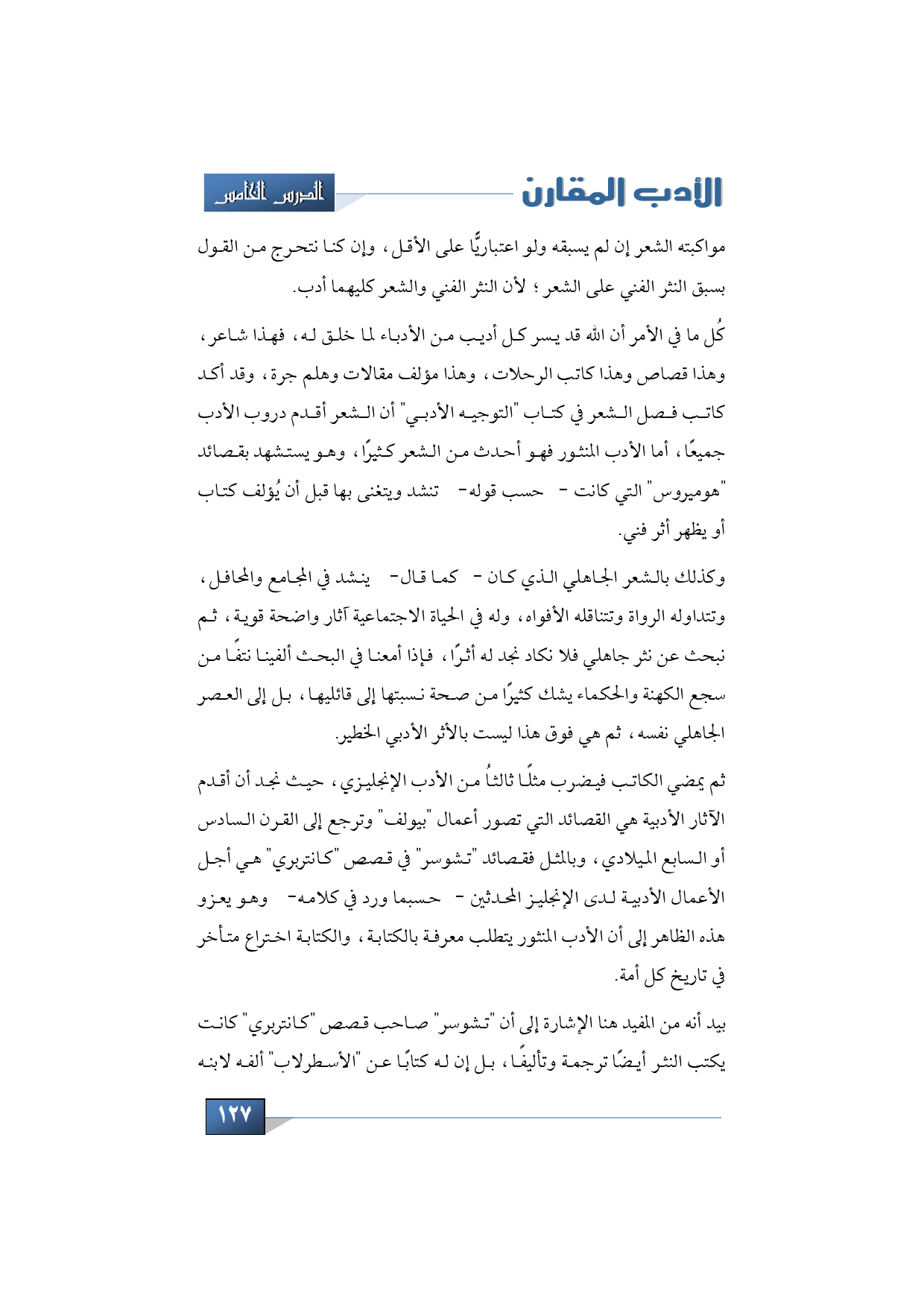 مواكبته الشعر إن لم يسبقه ولو اعتباريًّا على الأقل، وإن كنا نتحرج من القول بسبق النثر الفني على الشعر؛ لأن النثر الفني والشعر كليهما أدب.