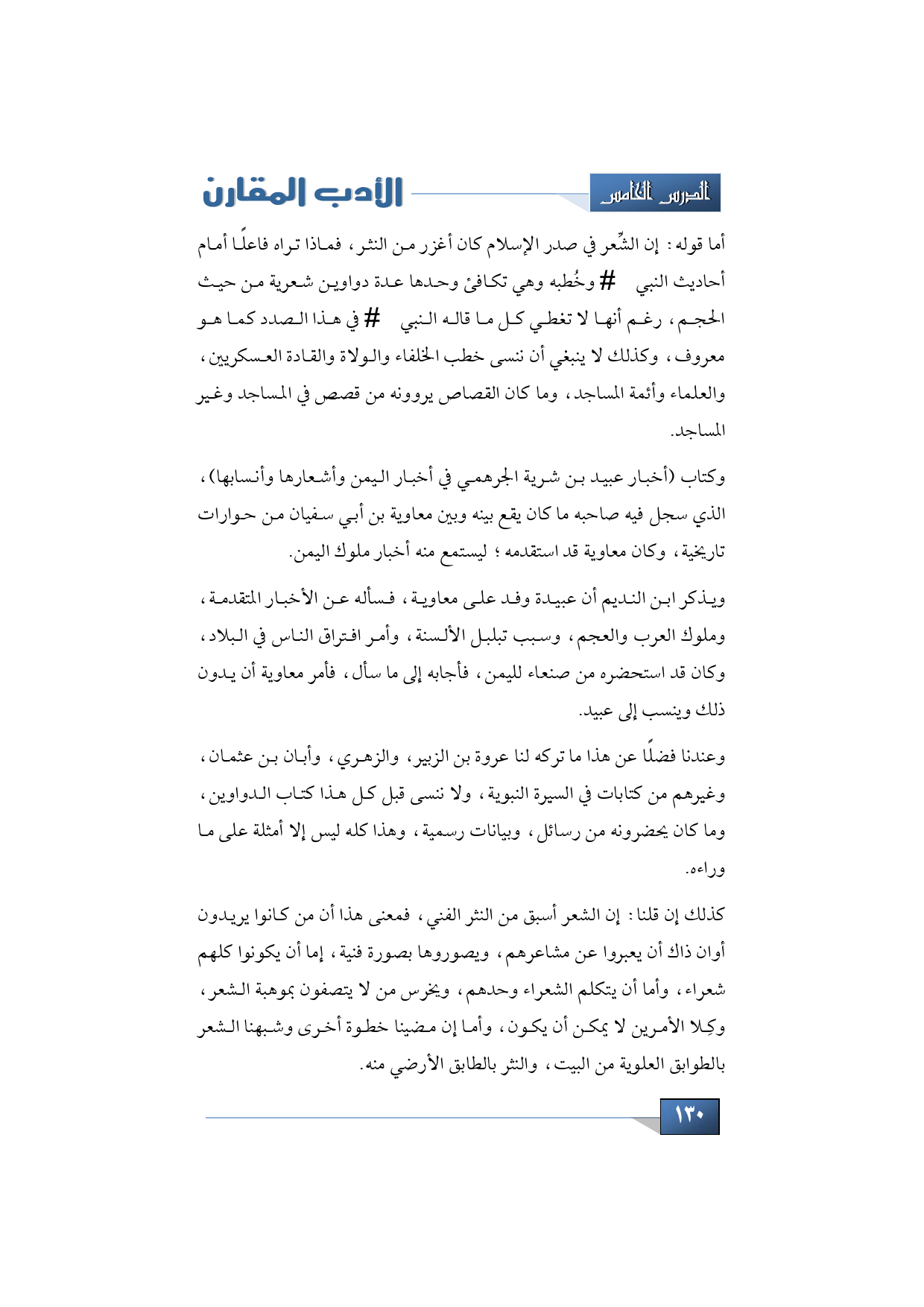 أما قوله: إن الشِّعر في صدر الإسلام كان أغزر من النثر، فماذا تراه فاعلًا أمام أحاديث النبي -عليه السلام- وخُطبه وهي تكافئ وحدها عدة دواوين شعرية من حيث الحجم، رغم أنها لا تغطي كل ما قاله النبي -عليه السلام- في هذا الصدد كما هو معروف، وكذلك لا ينبغي أن ننسى خطب الخلفاء والولاة والقادة العسكريين، والعلماء وأئمة المساجد، وما كان القصاص يروونه من قصص في المساجد وغير المساجد.