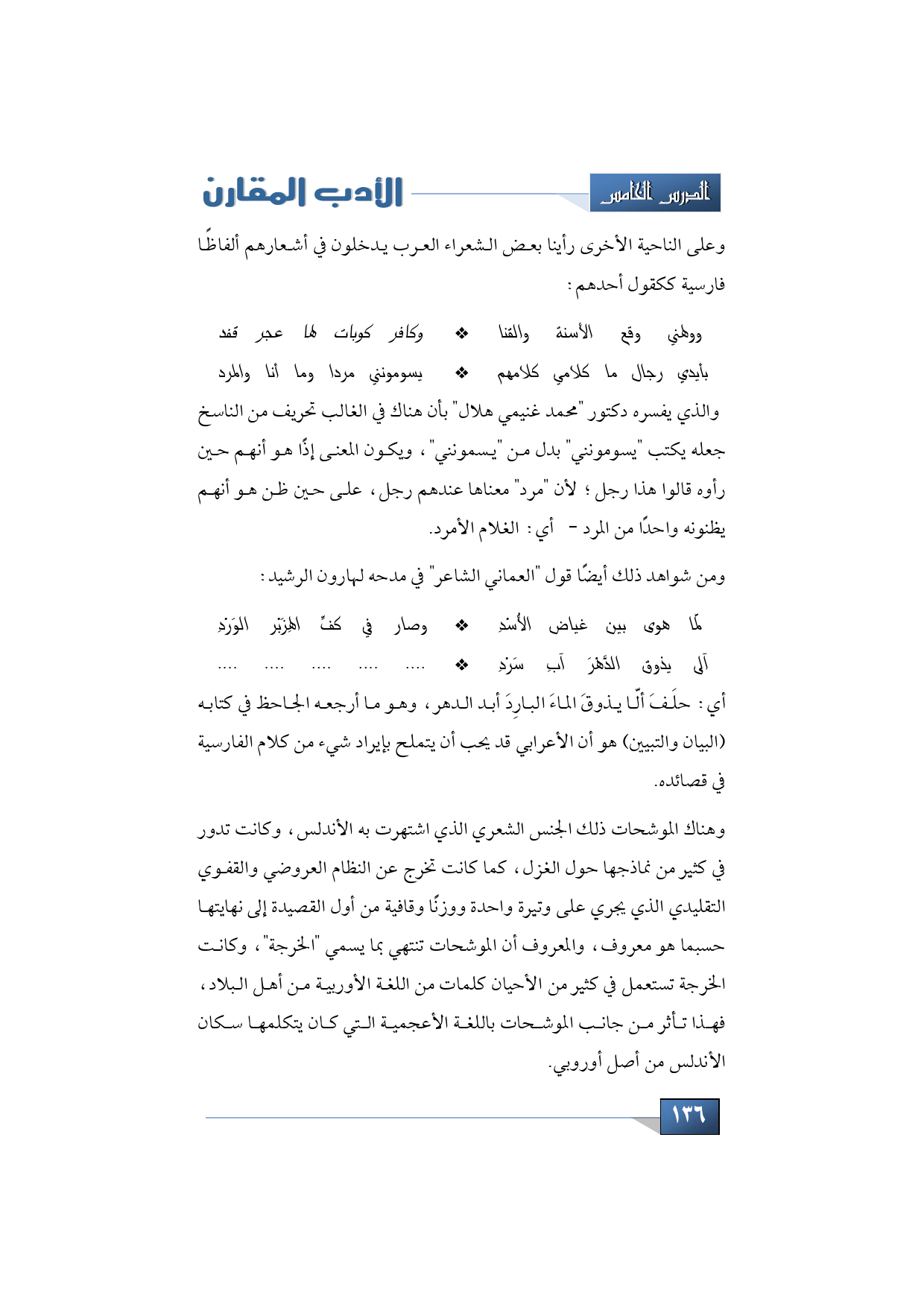 وعلى الناحية الأخرى رأينا بعض الشعراء العرب يدخلون في أشعارهم ألفاظًا فارسية ككقول أحدهم: