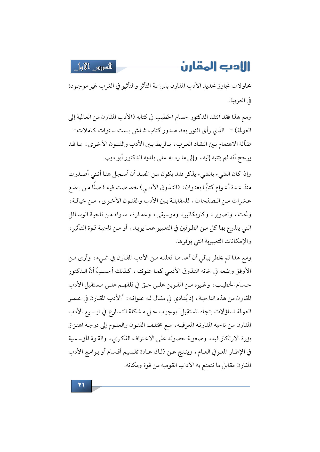 ومع هذا لم يخطر ببالي أن أعد ما فعلته من الأدب المقارن في شيء، وأرى من الأوفق وضعه في خانة التذوق الأدبي كما عنونته, كذلك أحسبُ أنّ الدكتور حسام الخطيب، وغيره من المقرين على حق في قلقهم على مستقبل الأدب المقارن من هذه الناحية، إذ يُنادي في مقال له عنوانه: "الأدب المقارن في عصر العولمة تساؤلات بتجاه المستقبل" بوجوب حل مشكلة التسارع في توسيع الأدب المقارن من ناحية المقارنة المعرفية، مع مختلف الفنون والعلوم إلى درجة اهتزاز بؤرة الارتكاز فيه، وصعوبة حصوله على الاعتراف الفكري، والقوة المؤسسية في الإطار المعرفي العام، وينتج عن ذلك عادة تقسيم أقسام أو برامج الأدب المقارن مقابل ما تتمتع به الآداب القومية من قوة ومكانة.