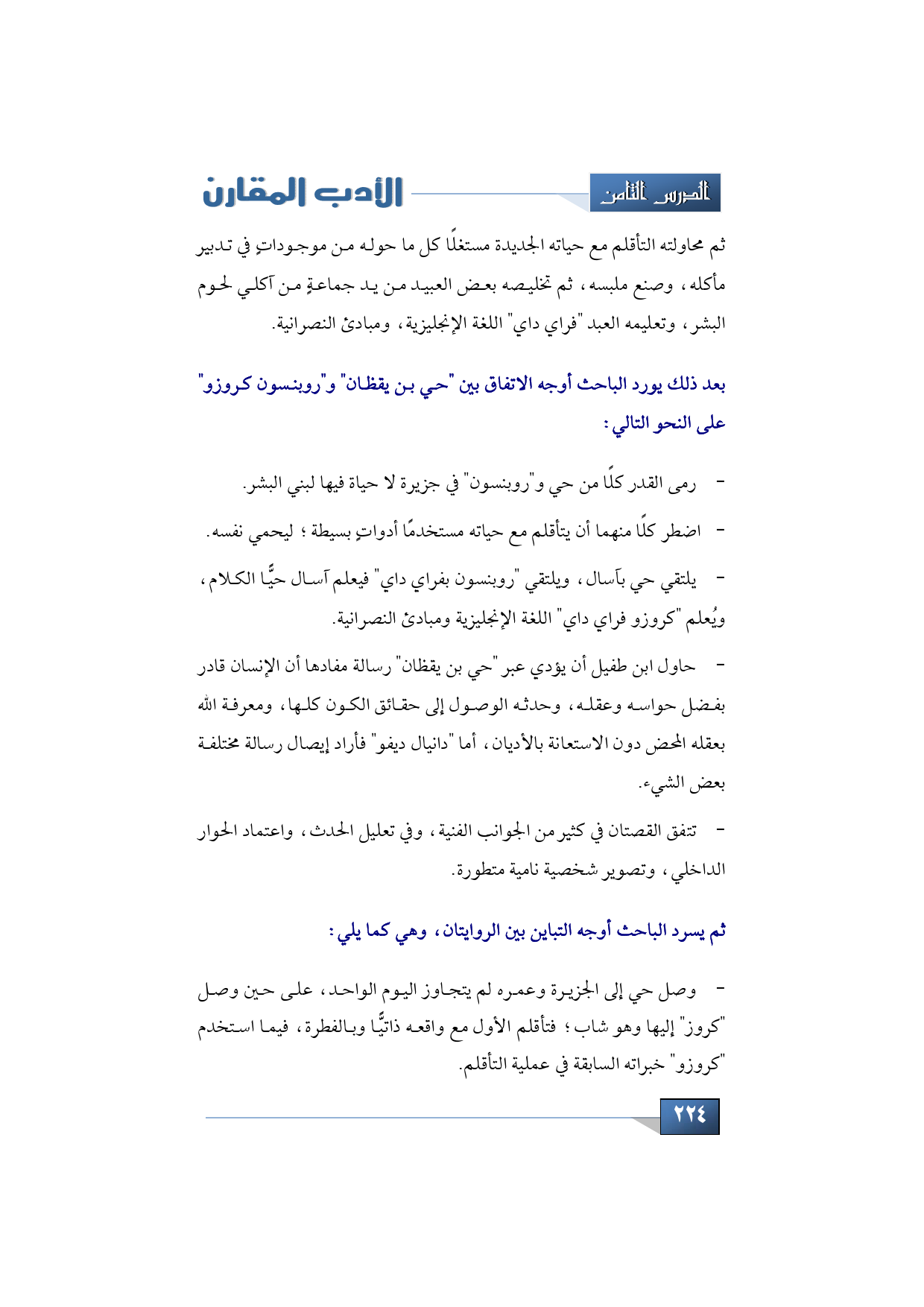 بعد ذلك يورد الباحث أوجه الاتفاق بين "حي بن يقظان" و"روبنسون كروزو" على النحو التالي: