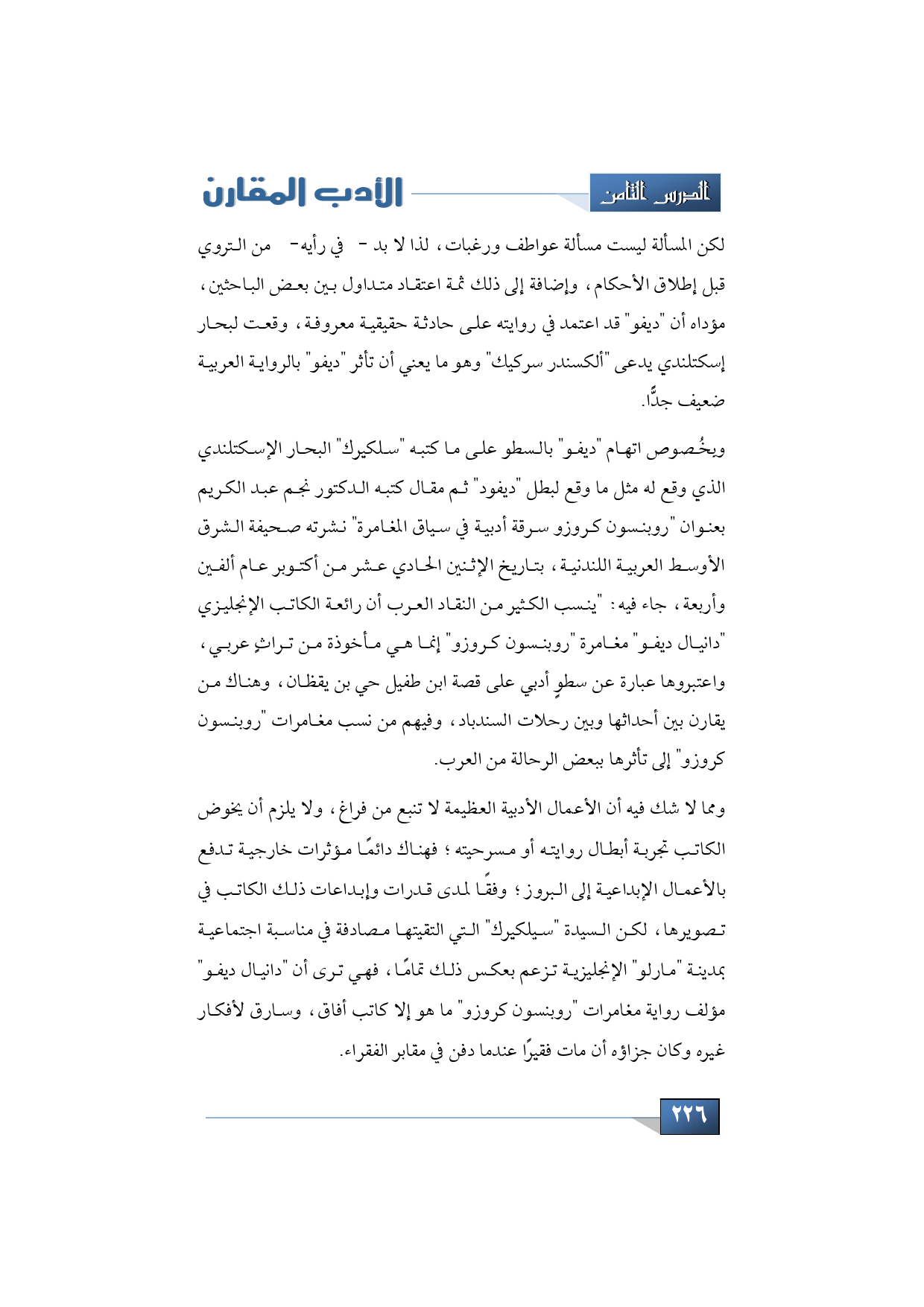 وبِخُصوص اتهام "ديفو" بالسطو على ما كتبه "سلكيرك" البحار الإسكتلندي الذي وقع له مثل ما وقع لبطل "ديفود" ثم مقال كتبه الدكتور نجم عبد الكريم بعنوان "روبنسون كروزو سرقة أدبية في سياق المغامرة" نشرته صحيفة الشرق الأوسط العربية اللندنية، بتاريخ الإثنين الحادي عشر من أكتوبر عام ألفين وأربعة، جاء فيه: "ينسب الكثير من النقاد العرب أن رائعة الكاتب الإنجليزي "دانيال ديفو" مغامرة "روبنسون كروزو" إنما هي مأخوذة من تراثٍ عربي، واعتبروها عبارة عن سطوٍ أدبي على قصة ابن طفيل حي بن يقظان، وهناك من يقارن بين أحداثها وبين رحلات السندباد، وفيهم من نسب مغامرات "روبنسون كروزو" إلى تأثرها ببعض الرحالة من العرب.