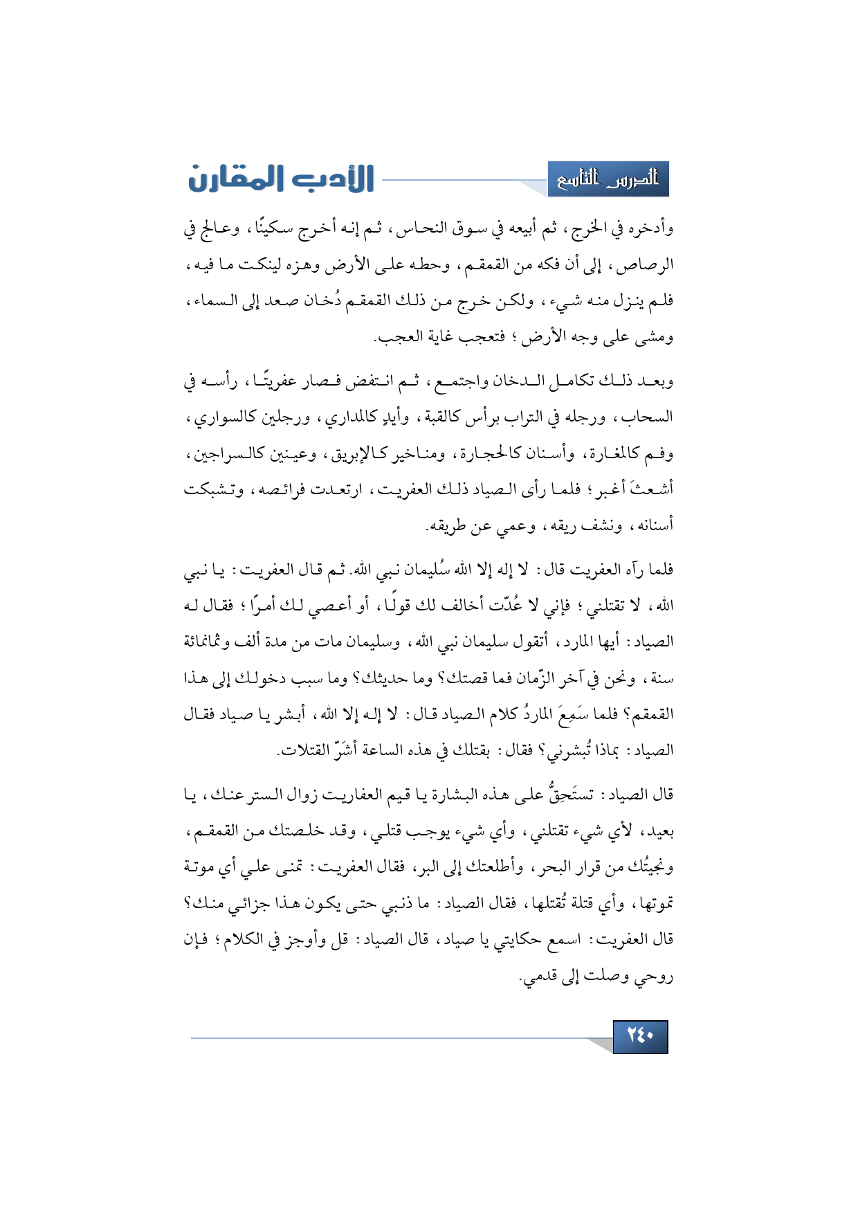فلما رآه العفريت قال: لا إله إلا الله سُليمان نبي الله. ثم قال العفريت: يا نبي الله، لا تقتلني؛ فإني لا عُدّت أخالف لك قولًا، أو أعصي لك أمرًا؛ فقال له الصياد: أيها المارد، أتقول سليمان نبي الله، وسليمان مات من مدة ألف وثمانمائة سنة، ونحن في آخر الزّمان فما قصتك؟ وما حديثك؟ وما سبب دخولك إلى هذا القمقم؟ فلما سَمِعَ الماردُ كلام الصياد قال: لا إله إلا الله، أبشر يا صياد فقال الصياد: بماذا تُبشرني؟ فقال: بقتلك في هذه الساعة أشَرّ القتلات.