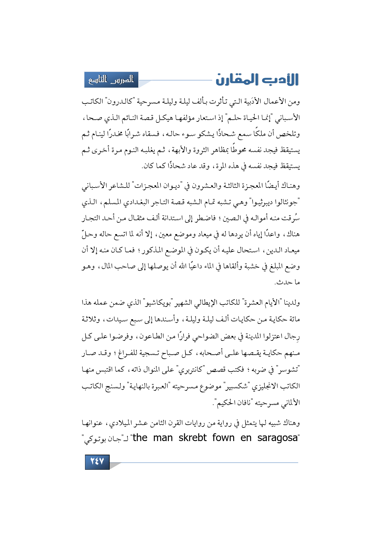 وهناك أيضًا المعجزة الثالثة والعشرون في "ديوان المعجزات" للشاعر الأسباني "جونثالوا ديبرثيوا" وهي تشبه تمام الشبه قصة التاجر البغدادي المسلم، الذي سُرقت منه أمواله في الصين؛ فاضطر إلى استدانة ألف مثقال من أحد التجار هناك، واعدًا إياه أن يردها له في ميعاد وموضع معين، إلا أنه لما اتسع حاله وحلّ ميعاد الدين، استحال عليه أن يكون في الموضع المذكور؛ فما كان منه إلا أن وضع المبلغ في خشبة وألقاها في الماء داعيًا الله أن يوصلها إلى صاحب المال، وهو ما حدث.