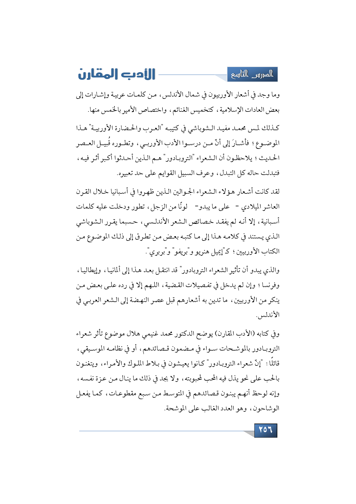 كذلك لمس محمد مفيد الشوباشي في كتيبه "العرب والحضارة الأوربية" هذا الموضوع؛ فأشارَ إلى أنّ من درسوا الأدب الأوربي، وتطوره قُبيل العصر الحديث؛ يلاحظون أن الشعراء "التروبادور" هم الذين أحدثوا أكبر أثر فيه، فتبدلت حاله كل التبدل، وعرف السبيل القوايم على حد تعبيره.