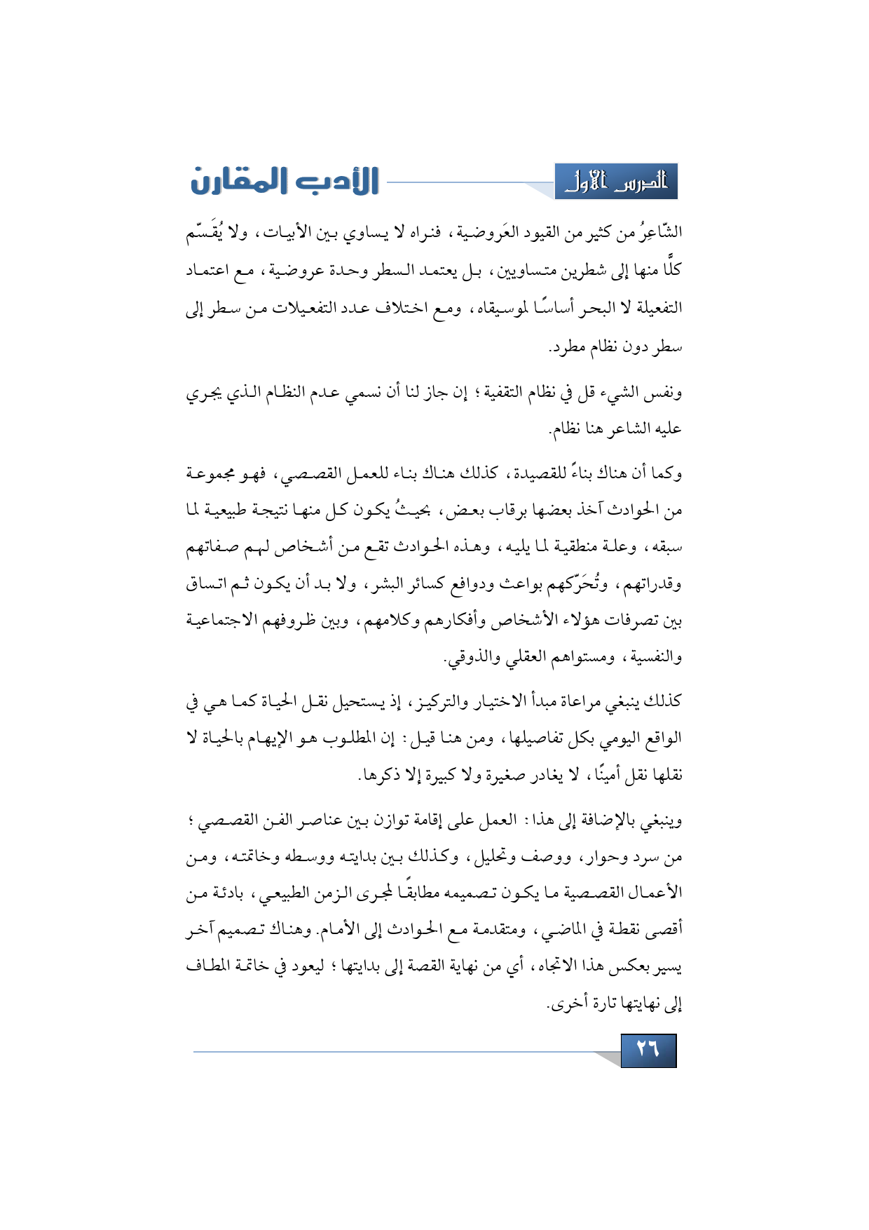 كذلك ينبغي مراعاة مبدأ الاختيار والتركيز، إذ يستحيل نقل الحياة كما هي في الواقع اليومي بكل تفاصيلها، ومن هنا قيل: إن المطلوب هو الإيهام بالحياة لا نقلها نقل أمينًا، لا يغادر صغيرة ولا كبيرة إلا ذكرها.